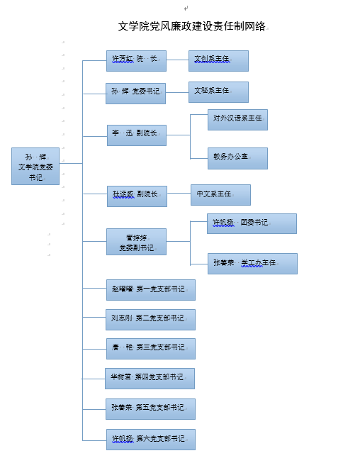 根据公司党风廉政责任落实的具体措施,公司党委制定了具体的党风廉政建设责任制网络,内容见下表:
