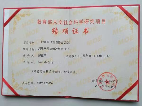近日,由必一运动解正明副教授主持的教育部人文社会科学研究项目《周恩来外交修辞创意研究》顺利结项,教育部社会科学司为解正明副教授颁发了结项证书。该项目发表了四篇研究型论文,撰写了一部近20万字的结项书稿。该项目的核心观点是:周恩来外交修辞的政治基础是“四个自信”。道路自信、理论自信、制度自信是周恩来外交修辞的政治基础,文化自信是周恩来外交修辞的“更基本、更深沉、更持久的”政治基础。