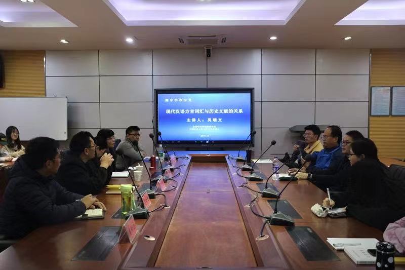 吴瑞文利用既有的现代湘语语料,从历史词汇的观点论述了湘语源自六朝江东方言。吴先生从不同于以往学者“词汇是否载入文献”以及“词汇在文献中的性质”的研究角度,而以《湘方言词汇研究》为参照,结合《方言》《广韵》《楚辞王逸章句》《说文解字》中所记载的古通语词,着重探讨了“现代湘语是否存在某个特定时代、特定地域的口语词”这一问题。他以六朝江东方言的三个口语词“渹(凊)”、“鼎(铛)”以及“侬(人)”为例,引经据典,从语音和语义两方面阐述三个口语词与历史文献的关系。最后,吴瑞文补充讲述了闽语与湘语的同源词,进一步论证了口语词汇在比较研究中的重要性。