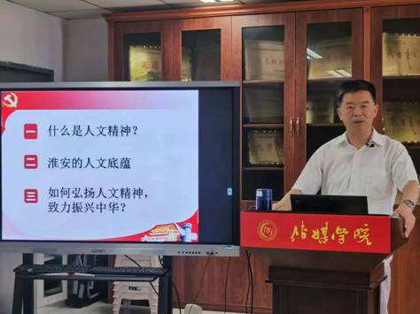 顾建国教授从人文精神、淮安的人文底蕴以及如何弘扬人文精神、致力振兴中华等三个方面教导新生树立远大的理想信念。在人文精神方面,爱国、明志、持节、自强、孝亲、勤俭、求新一直是中华民族传统的人文精神和价值观。作为一名大学新生,应主动接受中华民族人文精神和价值观熏陶,在新的环境中继续继承和发扬光大。顾建国教授还从驰誉四方的名人名著文化,扶弱济困、感恩励志的爱心文化,底蕴深厚的小说与戏曲文化,影响全国的漕运与水利文化,勇于抗争的革命文化等五个方面系统而全面的为2021级新生介绍了淮安的历史文化、风土人情和人文底蕴,增强了新同学对淮安的了解,拉近了每一位新同学与淮安的距离。顾建国教授说,作为一名新生应胸怀祖国、放眼世界,诚实做人、知行合一,努力学习、苦练本领,在新的奋斗起点上,在新的学习、工作环境中不断弘扬人文精神,努力为实现中华民族伟大复兴而不懈努力。