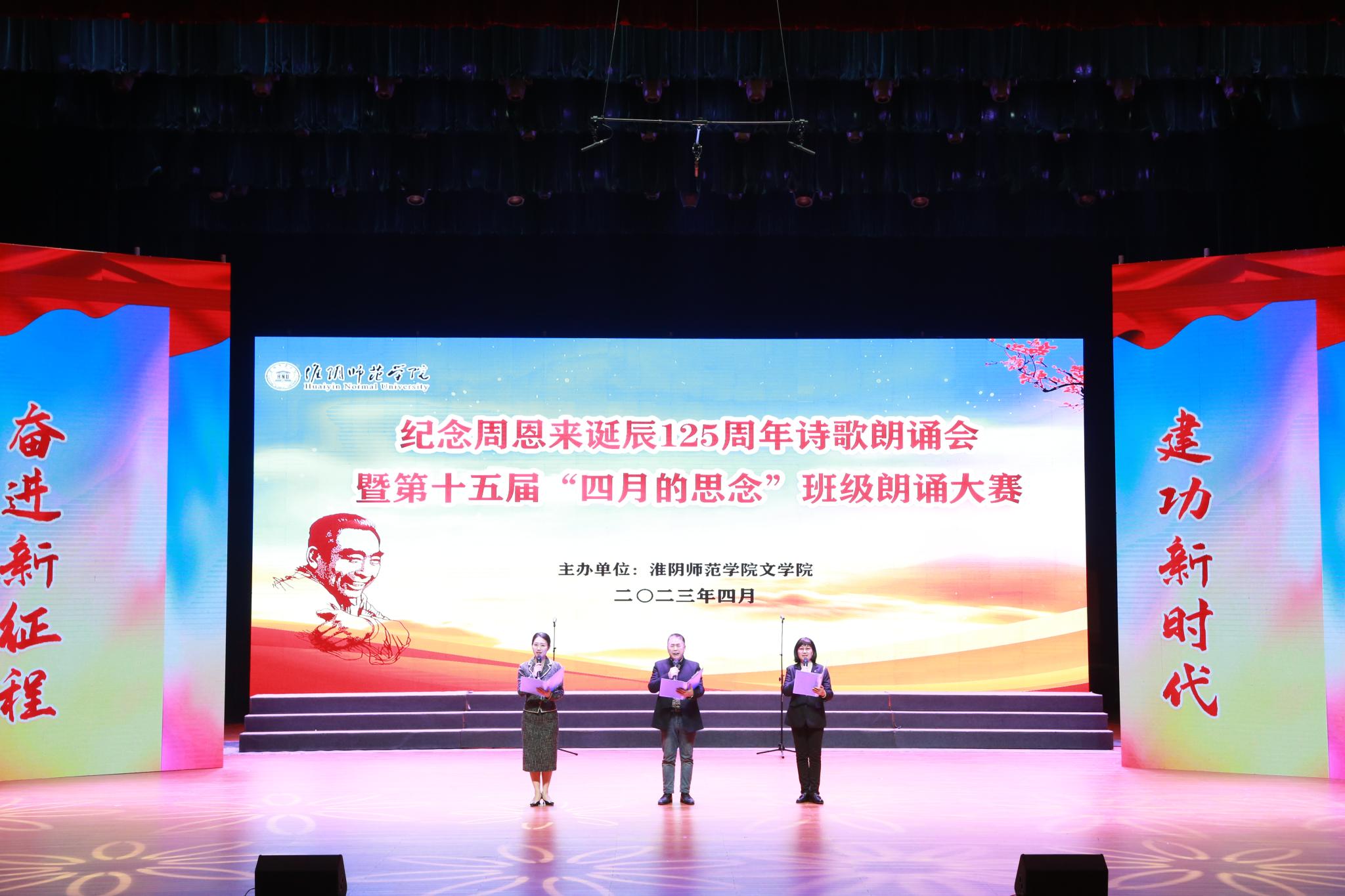 4月26日晚,纪念周恩来诞辰125周年诗歌朗诵会暨第十五届“四月的思念”班级朗诵大赛在音乐厅隆重举行。校纪委书记王旭,相关职能部门负责人,公司党政领导,辅导员和班主任观看比赛。同时,大赛邀请陈旻、刘尚云等关工委委员全程指导。淮安市广播电视台节目主持人、必一运动优秀员工2005届毕业生袁志超和吴冬梅担任主持。