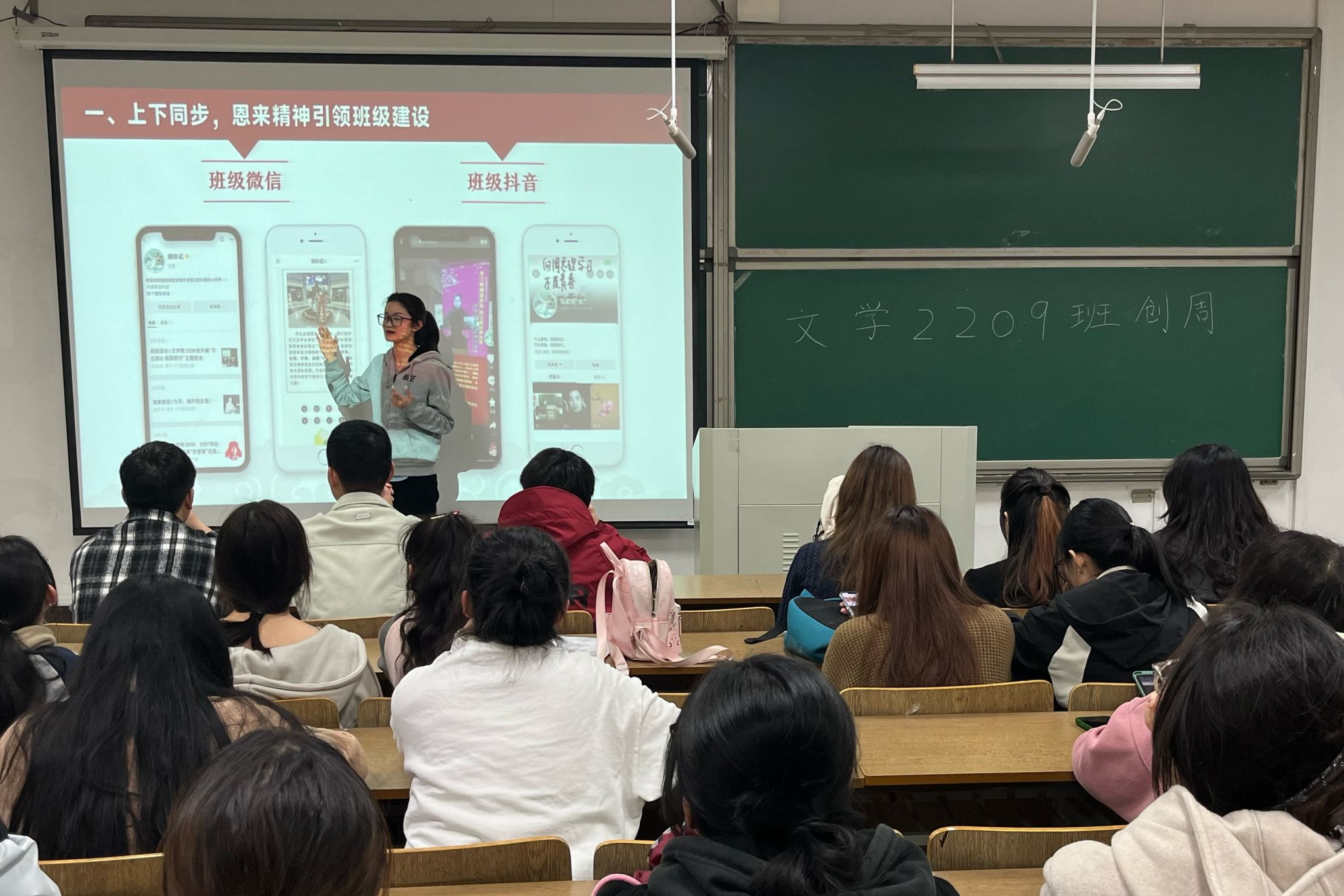 活动伊始,班长张欣然首先通过PPT展示了班级目前的“周恩来班”创建状况,对班级前期工作给予了充分肯定,并对班级未来提出殷切期望。她强调,“周恩来班”的创建要从“班级建设”“师范初心”“各类实践”三个方面着手,坚定理想,内外兼修,同时点面结合,提倡鼓励同学们积极投身于实践,顽强拼搏,奏响青春之歌。
