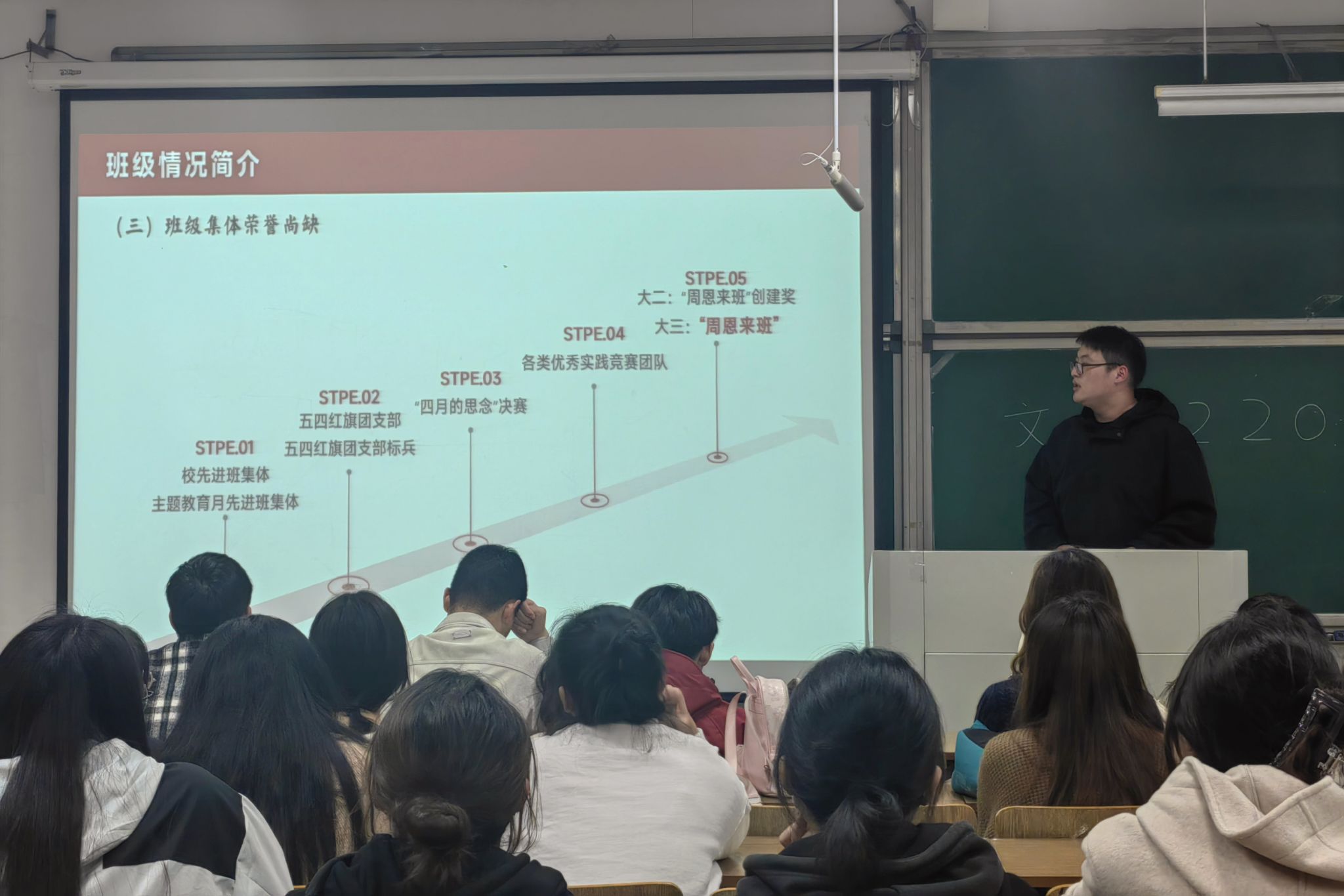 随后,团支书谢佳恒对“周恩来班”评审标准进行了解读,带领同学们回顾了公司“周恩来班”创建历程,对班级“周恩来班”创建进行了进一步的探讨。然后,他还展示了班级发展的逐步规划,并结合即将到来的“四月的思念”决赛对大家提出了新的希望;接着,他展望未来,对班级作出一系列的规划和奋斗目标,希望班级同学能在“周恩来班”创建这个过程中收获更多的成长、更大的进步,让班级收获更强的竞争力、更大的凝聚力。
