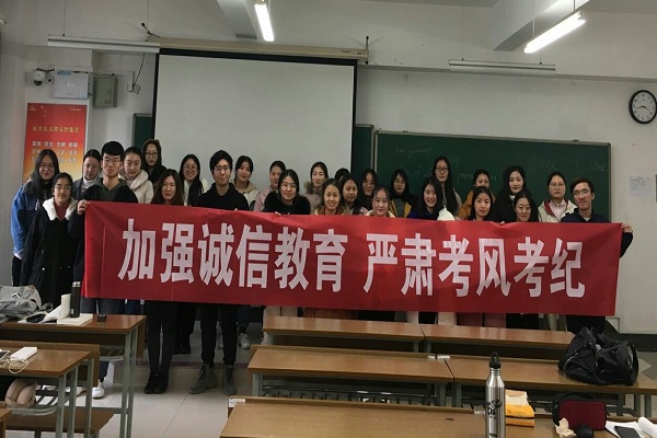 为了严肃考风考纪,加强老员工的诚信教育,本班于2018年12月18号,在弘文楼2-309教室组织开展"严肃考风考纪”主题班会,班会由班长主持,参加班会的有班主任老师和本班全体成员. 自觉遵守考试纪律,维护惨考试公正,以诚信考试为荣,以违纪作弊为耻,在各类考试中不作弊,严格履行自己的庄严承诺,做一个诚实守信的老员工。
