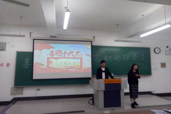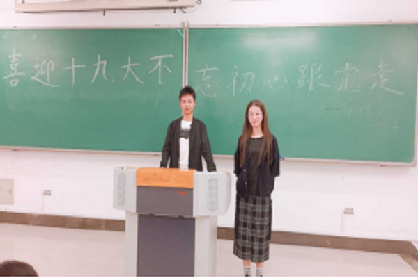 活动开始前,班团支部按团支书要求进行了一系列准备,力求将党的十九大的宗旨贯彻下去。活动开始,主持人潘凌云围绕迎接、宣传党的十九大作了介绍以及号召,团结全班同学听党话、跟党走,以饱满热情迎接十九大的到来,以高度的思想和行动自觉学习和贯彻党的十九大,并观看了有关十九大知识普及的视频。活动中,主持人通过“拼出一个伟大中国”有关视频给同学们介绍了党的历程,深化了爱国、爱党的情怀,还邀请了三位同学对自己的入团过程作了回忆,让同学们对自己的入团有了一个新的认识和感悟。活动结束前,以苏颖颖为代表的几位同学激情朗诵了诗歌《青春中国》,成功引起了班级同学的共鸣,收获了全班同学热烈的掌声。