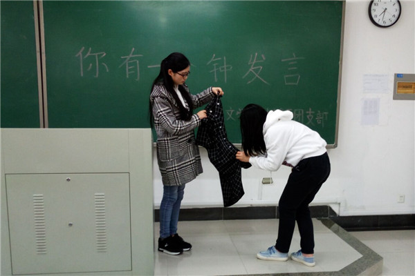 以青春之我,创建青春之家庭,青春之国家。习近平总书记曾说过:“青年的价值取向决定了未来整个社会的价值取向,人生的扣子从一开始就要扣好。”活动开始,团支书张璇带领全体同学重温入团誓词,齐唱团歌;接着,张璇为大家演示扣扣子要把第一粒扣子扣好,启发同学们自主自觉践行社会主义核心价值观,努力在实现中国梦的伟大实践中创造自己的精彩人生;演示完后,同学们感慨万千,竞相发言,从中国梦到理想信念再到担当,用一分钟的时间谈了谈自己对习近平讲话的感悟;最后,团支书做出总结并希望同学们能够做到知行合一,做合格共青团员。