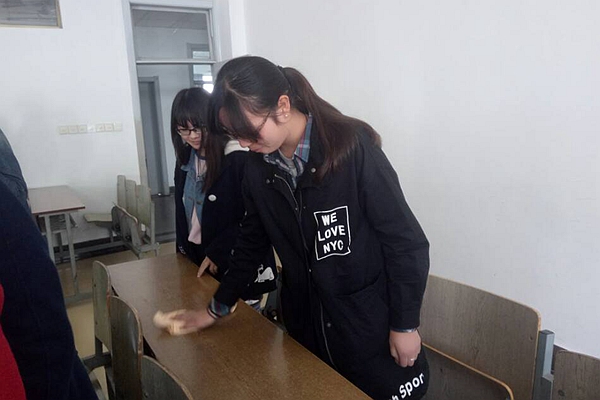 本次活动由团支书姜玉雯组织开展,全班同学们都积极参加。首先,同学们到教室集中,简单的讲述了一些要求,同学们便开始行动起来,拿出了提前准备好的抹布,认真开始打扫。打扫结束后,班干召集同学们开展心得分享会,大家争先恐后的发表自己的感想和想法,增加了互相之间的感情。
