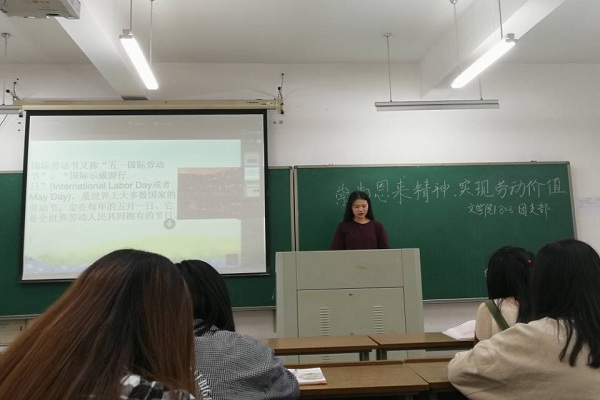 由刚刚过去的五一劳动节为例,李佳以PPT的形式向同学们详细地叙述了五一劳动节的背景、由来及意义,并指出其中的精髓:劳动者通过斗争争取合法权益。这样的伟大工人运动也让同学们初步领悟了人类文明历史进步的重要内涵。