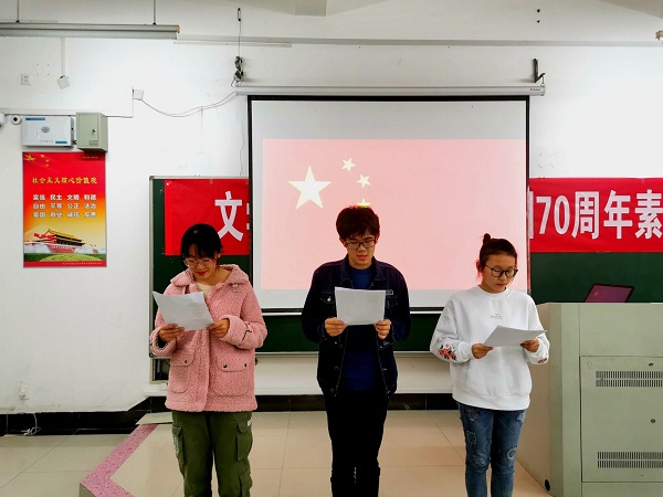 接着全体同学聆听同学组织的朗诵《歌颂祖国》,使同学们了解到了祖国的伟大,富强与繁荣,朗诵者声音洪亮,表达了对祖国深情地歌颂与赞美,有极大的渲染力,也因此增强了同学们在国家与班级的归属感。