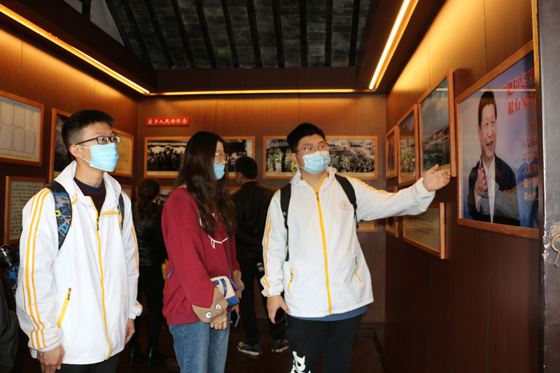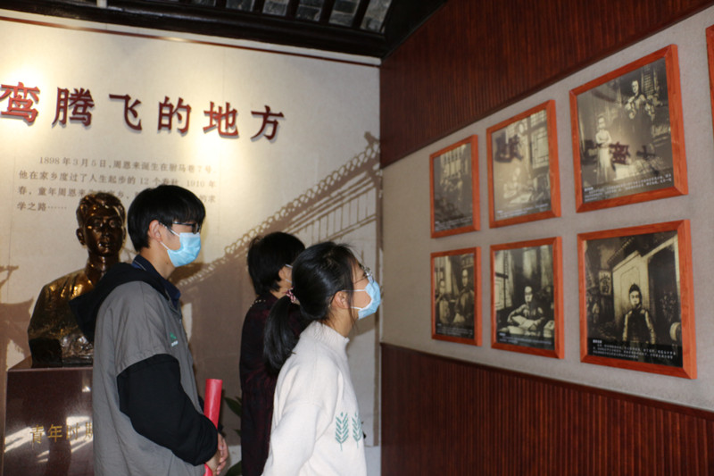 秋意阑珊的桃花垠边,蓝天映衬下的周恩来纪念馆庄严肃穆,前来瞻仰的人群络绎不绝。上午十点,同学们到周恩来故居门口集合并合影留念。经过安检和量体温,同学们陆续进馆参观。在一幅幅泛黄的历史照片前,在一件件珍贵的历史资料前,大家驻足凝视,认真听取讲解人员的介绍,观看周恩来童年用过的书桌、打着补丁的旧被褥、劳动过的菜地和厨房、百年历史的榆树等饱含沧桑的历史物件,深切缅怀周总理为党和人民奉献一切的光辉一生。