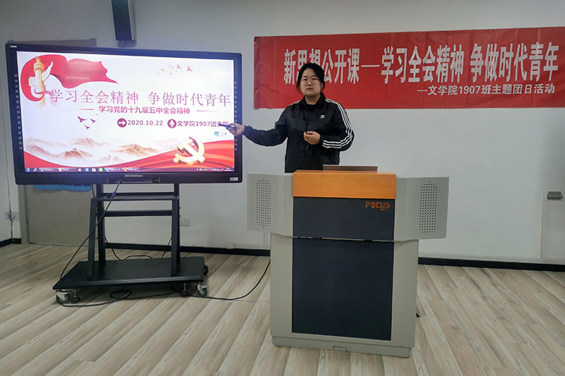 本次新思想公开课以学习宣传贯彻党的十九届五中全会精神为首要任务。声声团歌中,本次新思想公开课拉开帷幕。团支书于会议之初向同学们介绍了党的十九届五中全会,并指出全体团支部团员学习党的十九届五中全会精神的重要意义。党的十九届五中全会是我们党在全面建成小康社会胜利在望、全面建设社会主义现代化国家新征程即将开启的重要历史时刻召开的一次十分重要的会议,在党和国家发展进程中具有全局性、历史性意义。