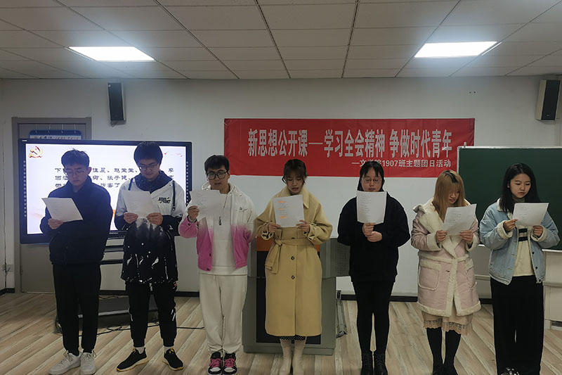 本次活动分为集中学习党的十九届五中全会精神理论、欣赏视频讲解、朗诵《厉害了,我的国》、全会知识问答、结合专业特色知识讨论十九届五中全会精神、共同宣誓几个板块。1907班同学在班级团委的组织下,仔细研读了中国共产党第十九届中央委员会第五次全体会议公报认真学习了习近平总书记在全会上的重要讲话精神和全会公报等重要文件,准确把握全会的精神实质和重大部署,并切实把思想和行动统一到全会精神上来。