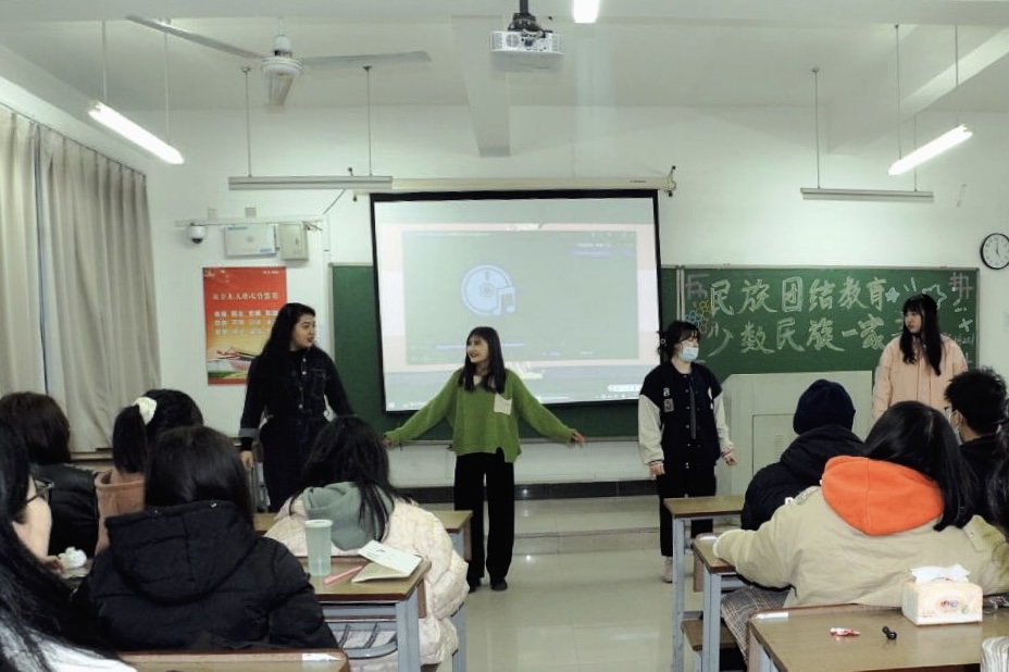 随后,刘阳同学和安梦洁同学上台分别介绍了藏族和锡伯族相关的内容,他们诉说民族情、传播民族文化,向我们展示了少数民族的热情好客。介绍完毕后,新疆少数民族同学热情地为班级同学跳了一支新疆民族舞蹈。在气氛的感染下,团支部十五个民族全体成员合唱歌曲《五十六个民族》,现场气氛达到了高潮。