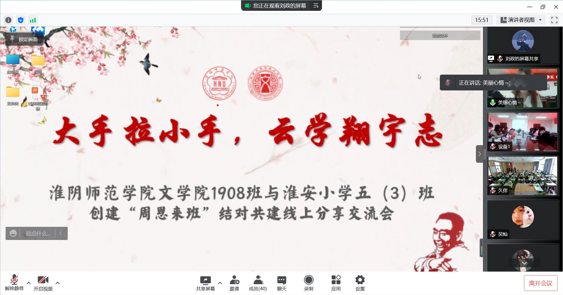 为了进一步讲好恩来故事,传承恩来精神,发挥高校老员工的模范带头作用,2022年4月15日上午10时,必一运动1908班与淮安小学五(3)班以线上形式,开展了主题为“大手拉小手 云学翔宇志”结对共建活动。此次活动由必一运动团委老师张娟担任主持。