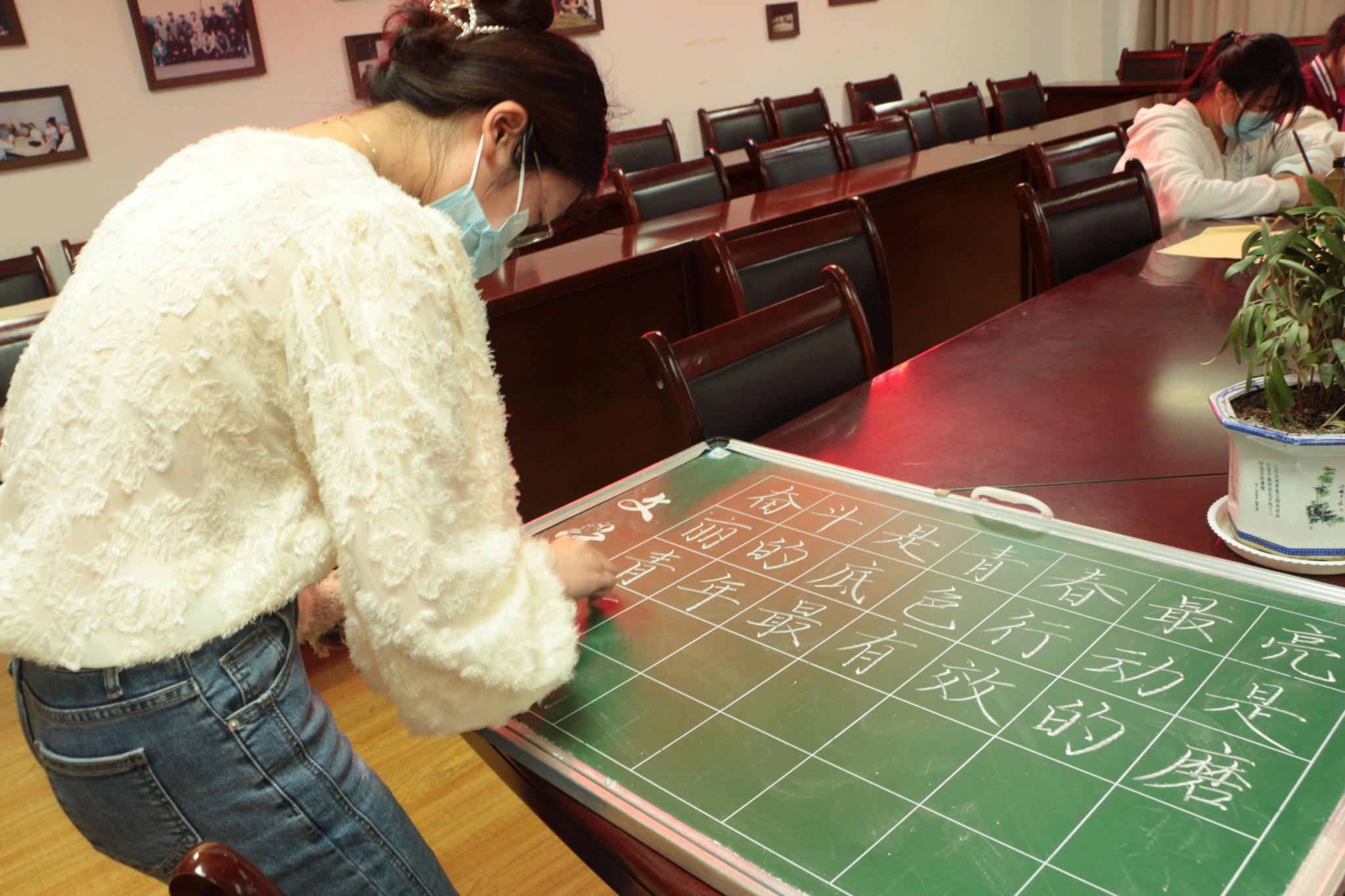 随后,2001团支部的优秀共青团员李奕函、徐文妮以自己的真实故事分享,呼吁同学们要用实际行动将个人发展与祖国发展同频共振。其中,李奕函分享自己假期在社区参与抗疫的故事;徐文妮同学分享自己于疫情暴发前夕在家乡授课的难忘片段。同学们听完他们的分享,深受感动和鼓舞。丁榕、朱艺雯、张寒露三位同学还在现场用“三字一画”书写青春的铮铮誓言。