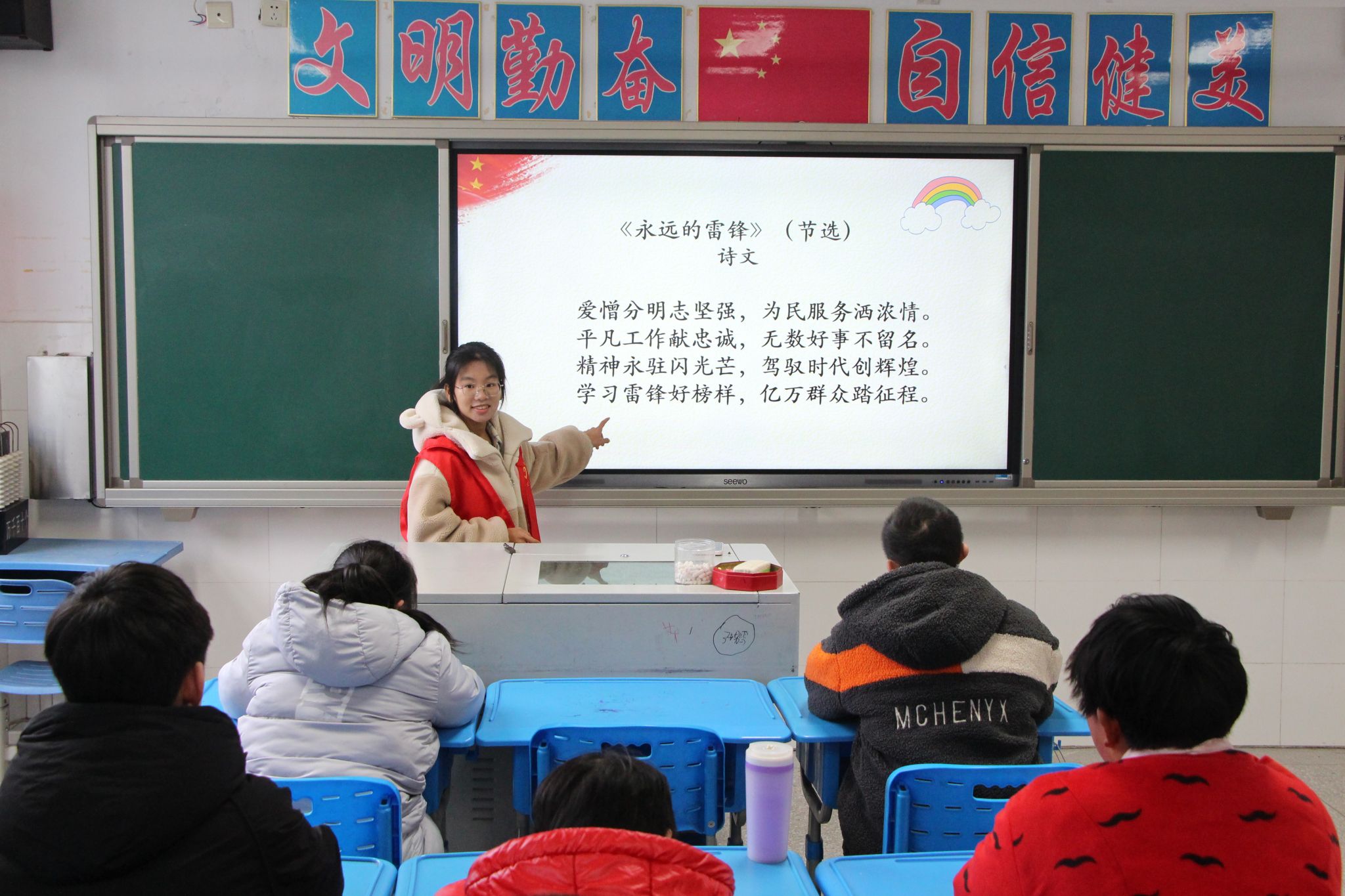 活动当天,志愿者们在孩子们热烈的欢迎声中走进教室,在与孩子们做完简单的暖场互动后,开启了学雷锋特色主题班会。会长王靖如首先向孩子们介绍了雷锋的生平经历与雷锋精神,随后方铭枝带着孩子们一起诵读诗文《永远的雷锋》,声情并茂的朗诵声在教室里回响。