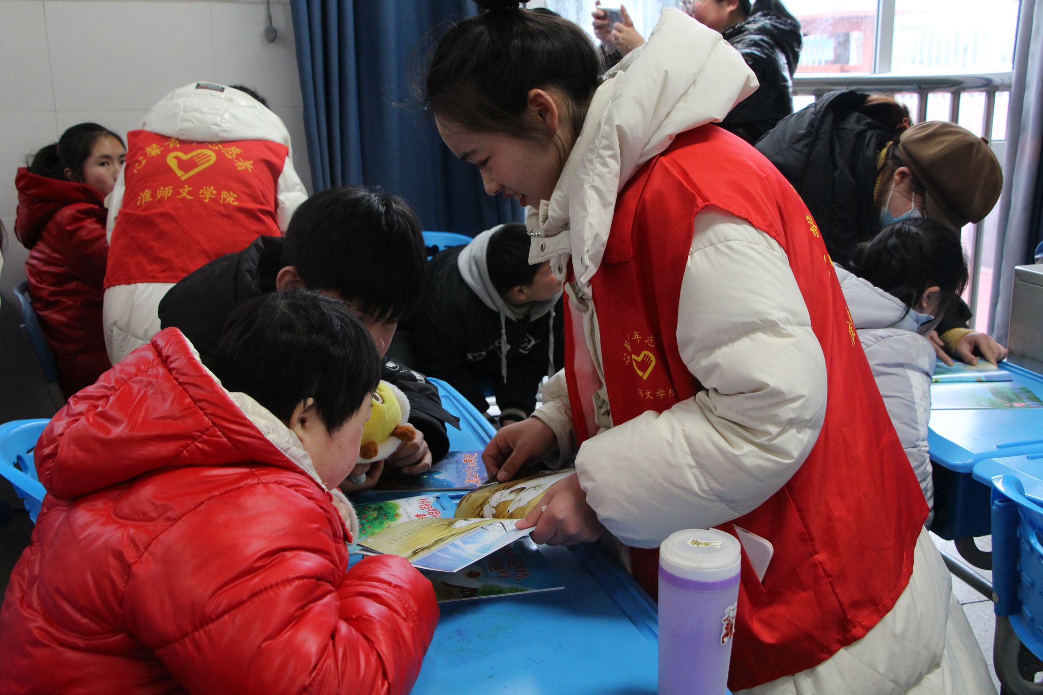 在与孩子们进行一番交流过后,志愿者们分发带来的绘本书籍,来到孩子身边,亲自为孩子们朗读。