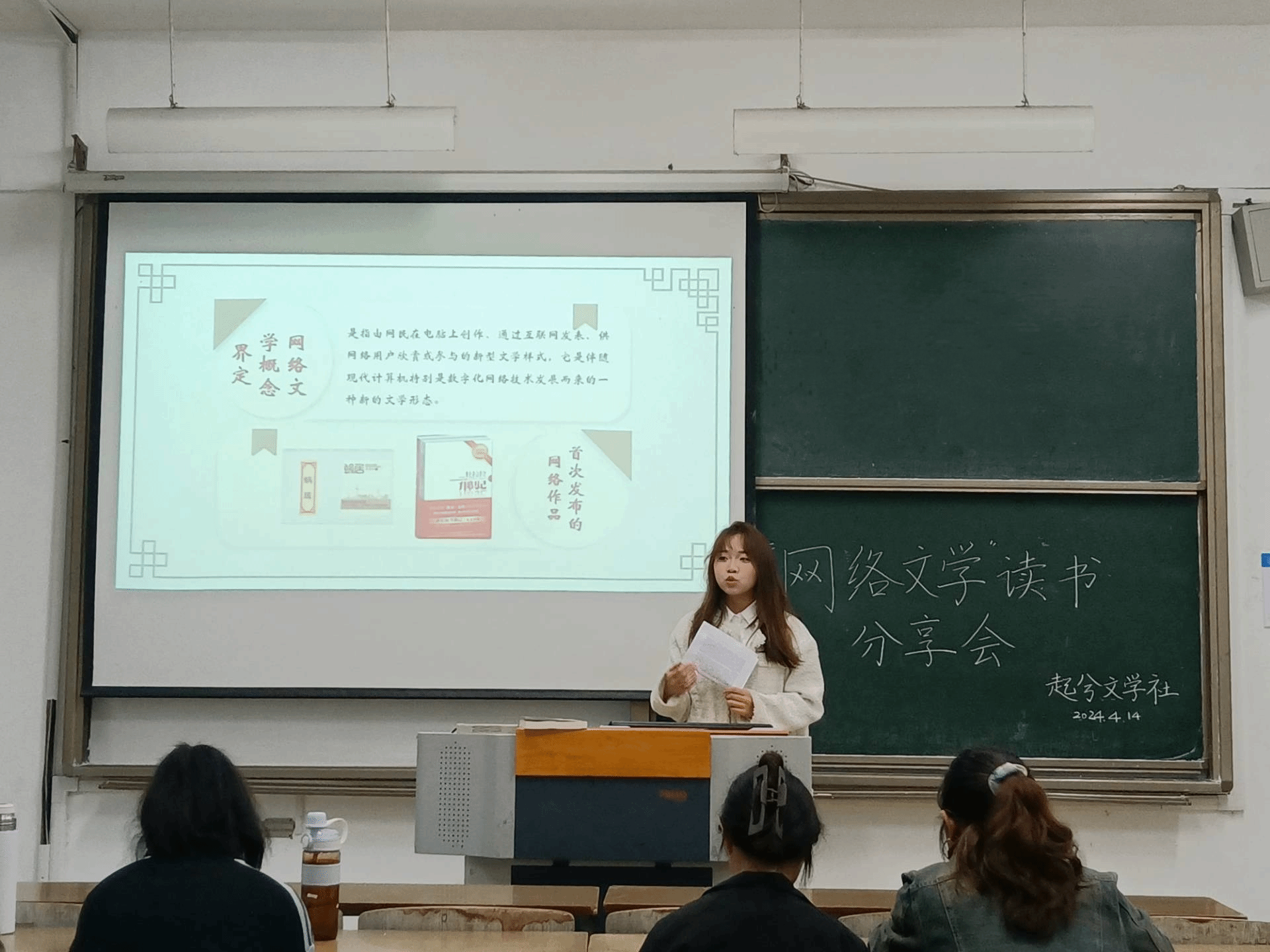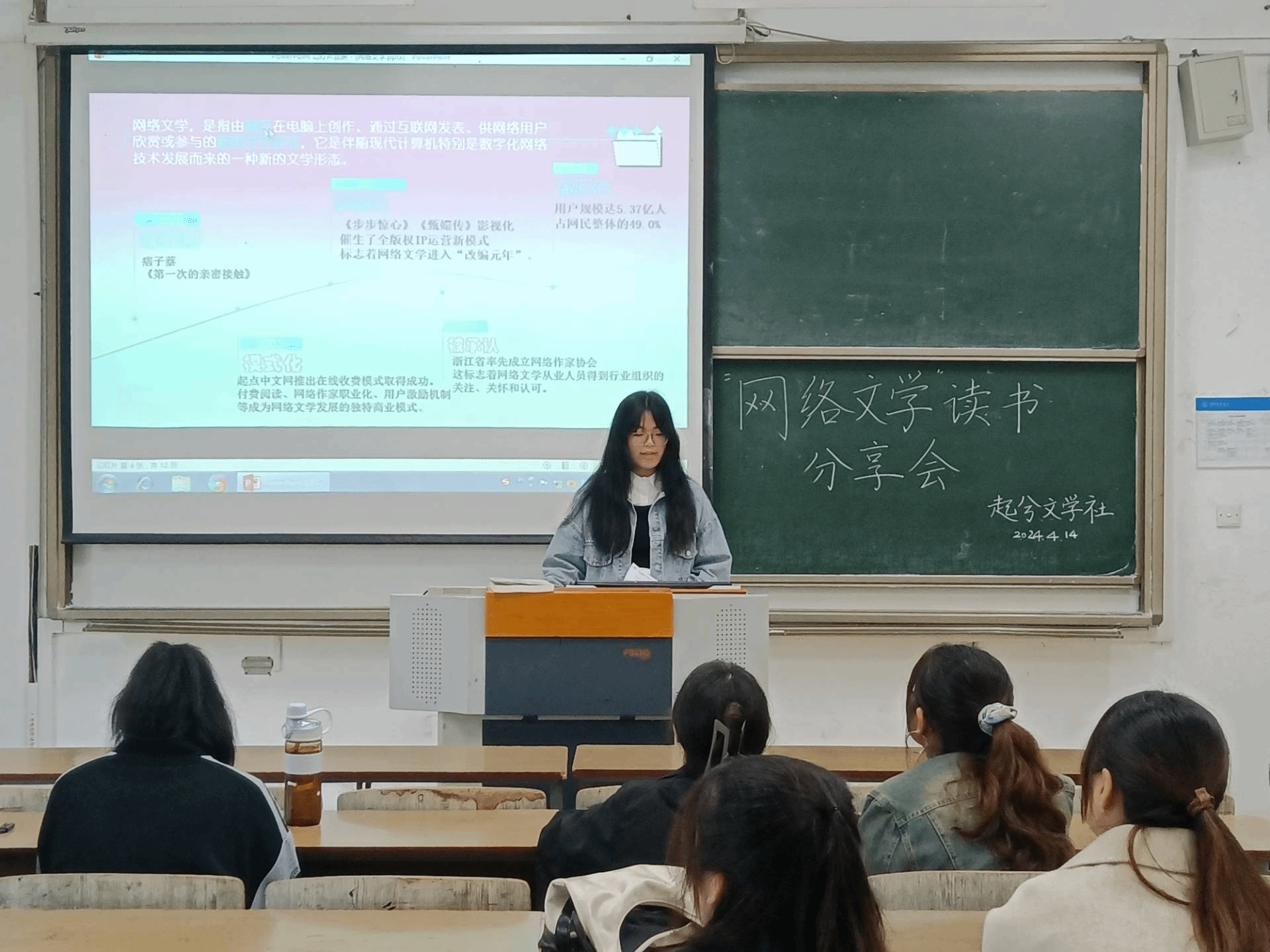 网络文学是一种由电脑创作,在互联网上传播、供网络用户浏览或参与的新型文学样式,是当下我国阅读量最大、读者最多的文学类型。为响应“勤奋 求实 创新 奉献”主题教育月活动,给同学们带来更多价值思考,起兮文学社于4月14日下午开展一场精彩的线下读书分享会。