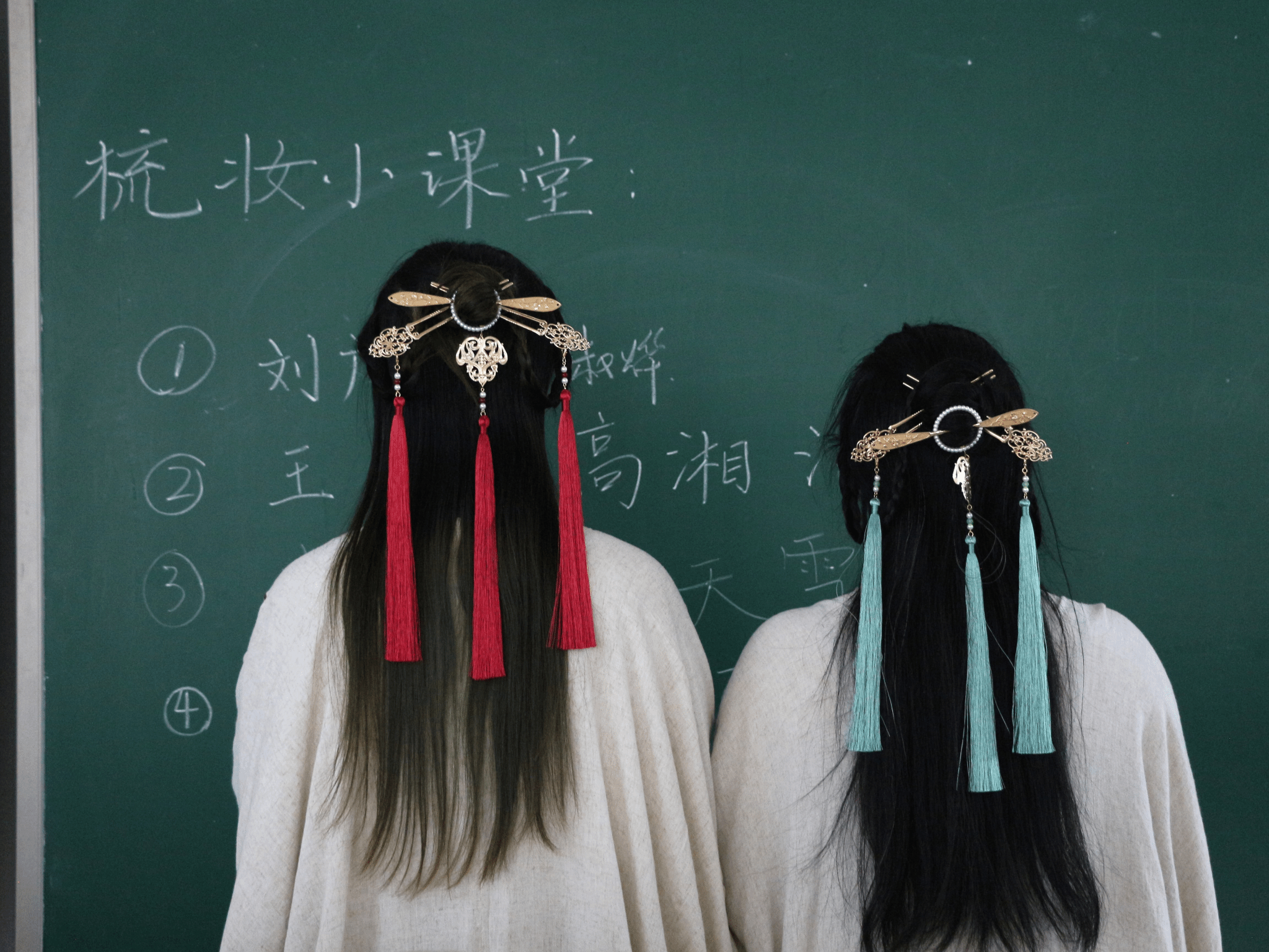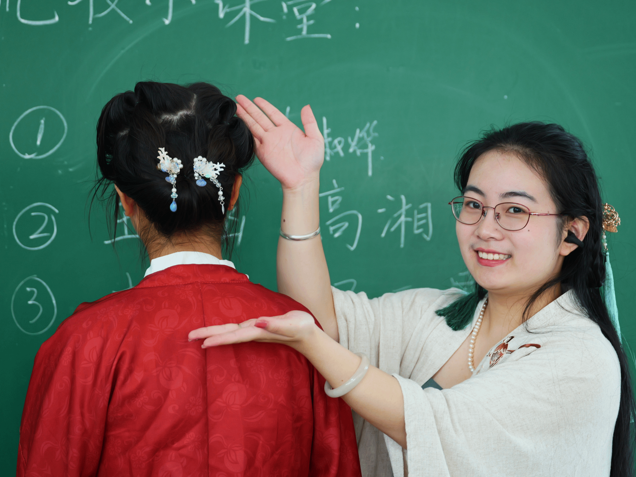 珠翠琳琅,环佩叮当。同学们不仅被梳妆师们精湛的技艺所折服,更被古典发式所蕴含的深厚文化底蕴所吸引。同学们还有机会亲自上阵,尝试编发。在梳妆师的耐心指导下,同学们认真学习,从最初的生疏到后来的熟练,对古典发式有了更深的理解和感悟。在这个过程中,同学们不仅体验到了古典发式的独特韵味,更在亲手实践中感受到了传统文化的魅力与温度。