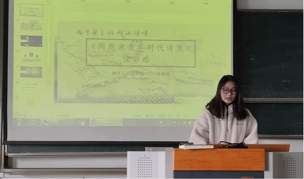 分享会由四个核心部分组成,分享会以是周恩来研究会员工分会的会长,来自2204班的潘孙畅同学为大家致开幕词开始。第一个环节是周协朗诵小组带来朗诵篇目——《月光下的中国》;第二环节是观看视频《革命理想大于天》;第三个环节是周协副会长,来自2306班的郭璇同学为我们分享恩来精神故事;最后一个环节是学子心声,这个环节中,2203班的张煜焓同学分享了阅读《周恩来青年时代诗集》后的感悟。分享会的最后,周协副会来自2204班的王涵同学向大家致闭幕词。随着分享会的进行,参会同学对周恩来总理的了解也越来越深入,周总理的故事感动了在场的每一位同学。