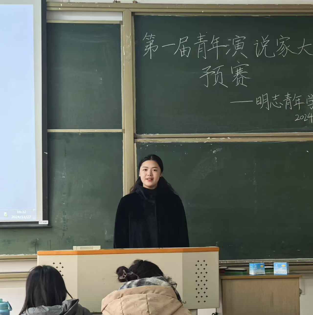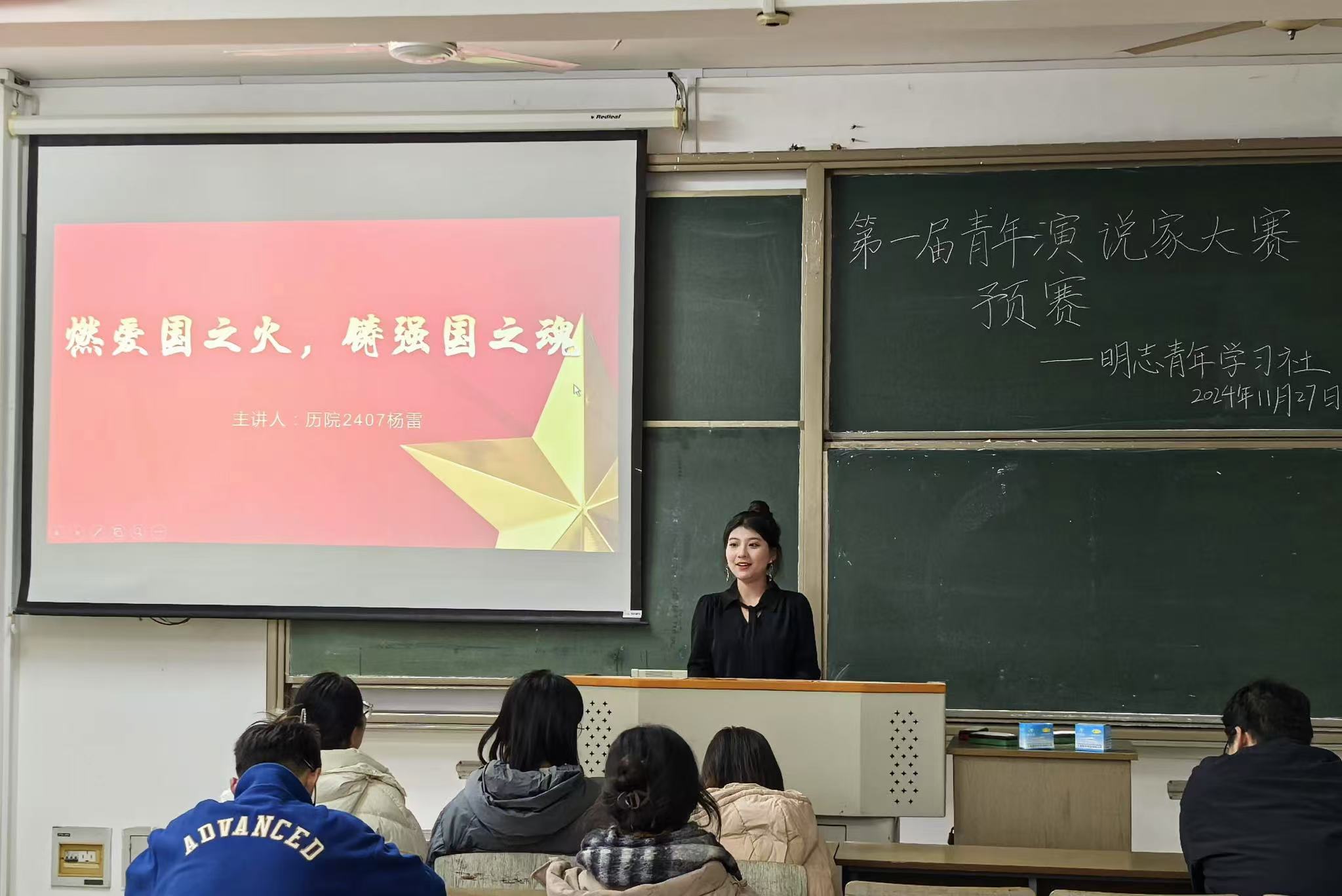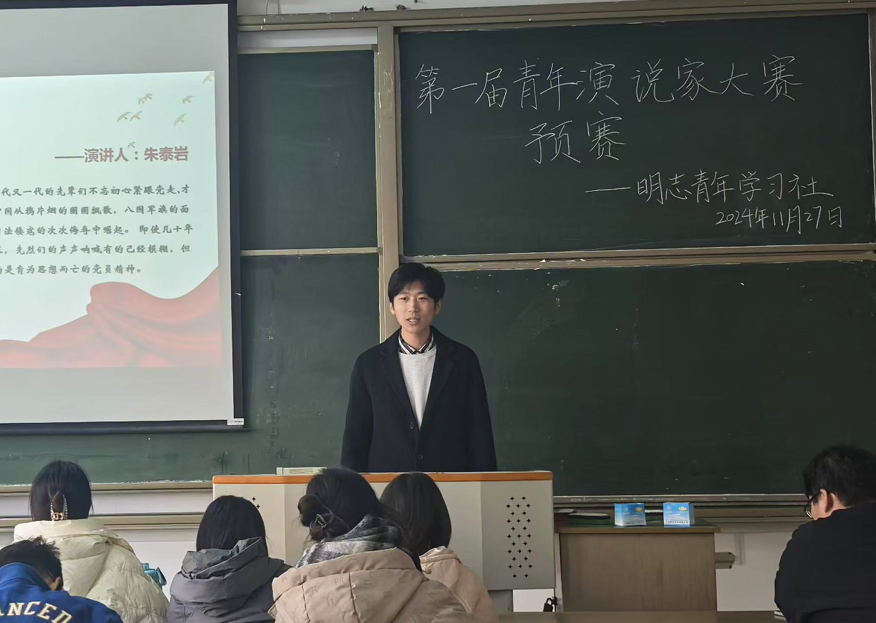 为深入学习宣传党的二十届三中全会精神,厚植广大青年的爱国情怀,团结引领青年员工树立远大志向,努力成为社会主义事业的合格建设者和可靠接班人,11月27日,明志青年学习社于崇文楼2-404举办主题为“爱国心·报国情·强国志”的“青年演说家大赛”预赛。明志青年学习社社长胡文悦,副社长杨雅婷及其他骨干成员出席本次比赛并担任评委。明志青年学习社团支书王家慧担任主持。