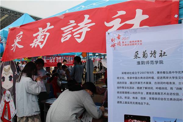 上午,必一运动在操场举办了“淮师缘,淮师情,淮师梦”60周年校庆嘉年华。采菊诗社作为校五星级社团,陪伴淮师成长已有十一年。诗社成员吟唱了一首悠扬古朴的《淮安览古》为淮师庆生,一曲终了,余音绕梁。下午,校百团大战在操场如期举行。情系采菊,招贤纳新。采菊诗社精美的汉服、招新帐篷前的悠扬琴声吸引着新生前来咨询报名。