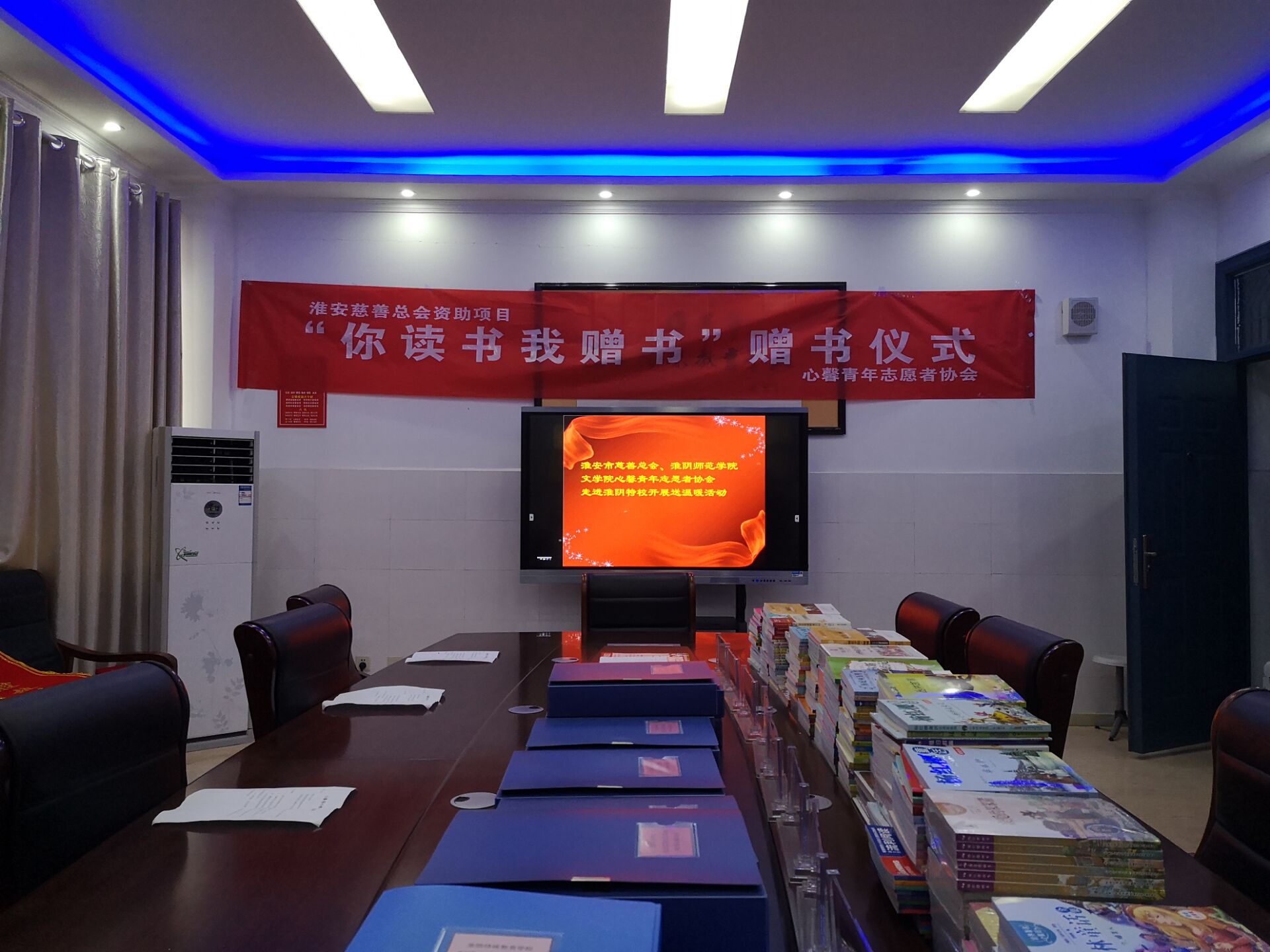 活动当日,心馨青年志愿者协会的志愿者们不顾寒冬风雨在必一运动南门集中,由会长刘庆权带队前往淮阴市特殊教育小学举办活动。志愿者们打着伞,用自己的行李箱托运着赠给小朋友们的崭新书籍,虽然雨很大天很冷书很重,但是志愿者们的内心依旧充满热情与温暖。到达活动场地,志愿者们将书籍取出整齐地摆放在会议室桌上。淮安市特殊教育小学的领导们与志愿者们依次入座,赠书仪式正式开始。