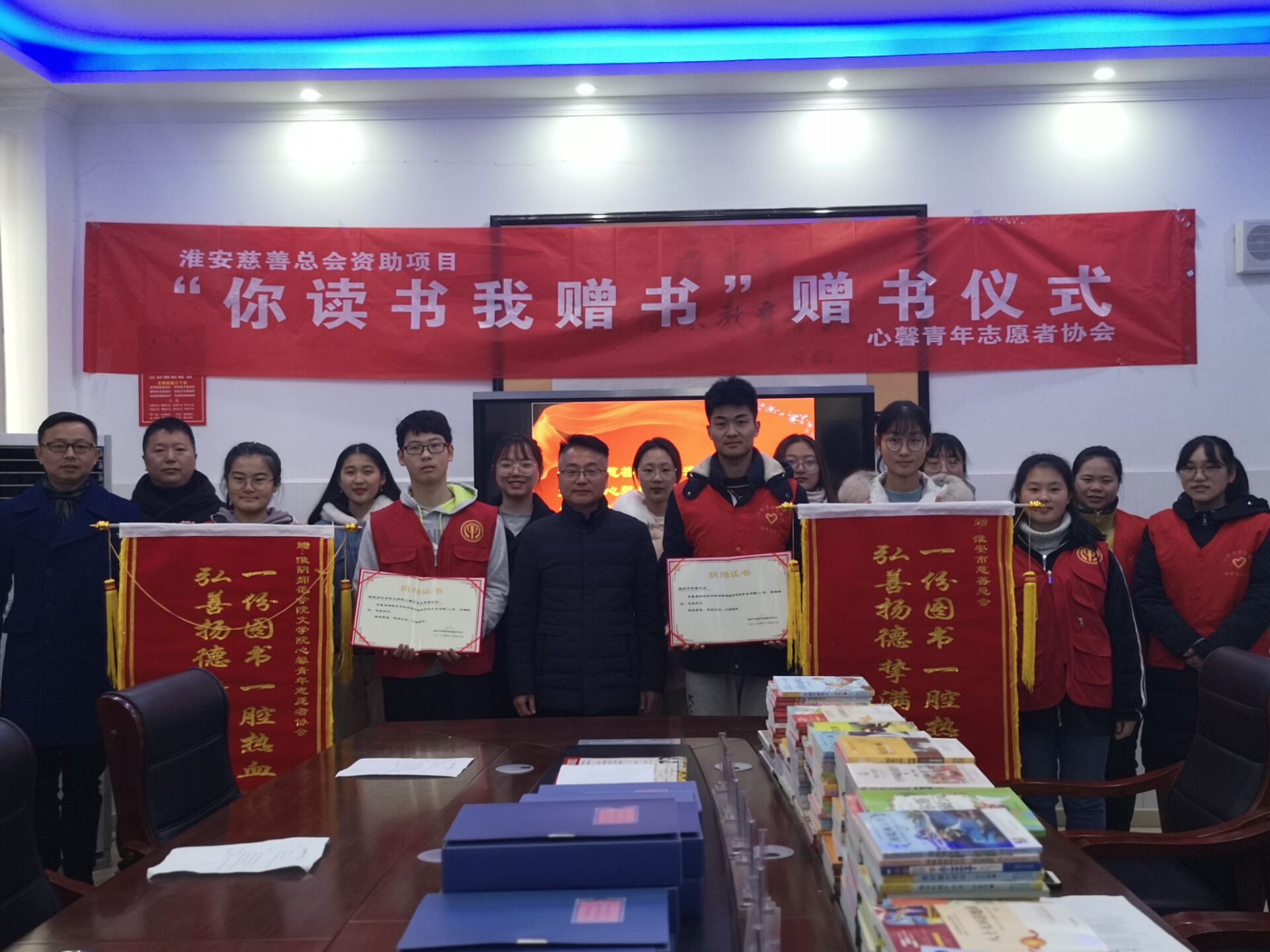 首先,淮安市特殊教育小学的领导们介绍了淮安市特殊教育小学的历史背景、主要教育对象以及教育人员物资,并且就此次赠书活动发表他们公司的看法和感谢,他们希望我们社团能够经常在淮安市特殊教育小学举办志愿活动,还期盼着我们可以在特小开设心理咨询课堂,帮助特小的孩子们勇敢面对未来美好的生活。其次,心馨青年志愿者协会的志愿者们的进行自我介绍,再由团支书张新雨发言介绍心馨青年志愿者们协会的历史风采以及我们社团举办过各种类型的志愿活动。接下来由淮安市特殊教育小学的领导亲手赠与心馨青年志愿者协会证书与锦旗,并由特小的摄影师拍照留念。最后,志愿者们将书籍都移到图书馆供孩子们阅读,活动正式结束。