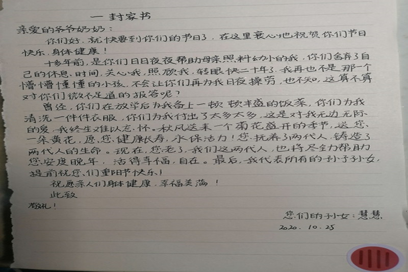 自古以来,重阳节就被赋予美好的祝愿。“独在异乡为异客,每逢佳节倍思亲”。此次活动内容主要分为两部分,即视频寄相思与家书话衷肠。如今科技日益发达,对于远在异乡、无法与家人团聚的我们,就可以通过视频通话来表达自己对于家中老人的思念,共话家常,并写下自己的一些感悟。家书是一别之后的无尽相思,每每研墨落笔,短短几行字写不尽相思意,字字精巧,句句隽语。岁岁重阳,今又重阳,相思述不尽。重阳节之际,同学们一封封家书话衷肠,给自己家中的老人们送上了最美好的祝愿。同学们通过家书寄托思念,感受温情,而家人们也能欣慰地看到子女在外的学习生活。