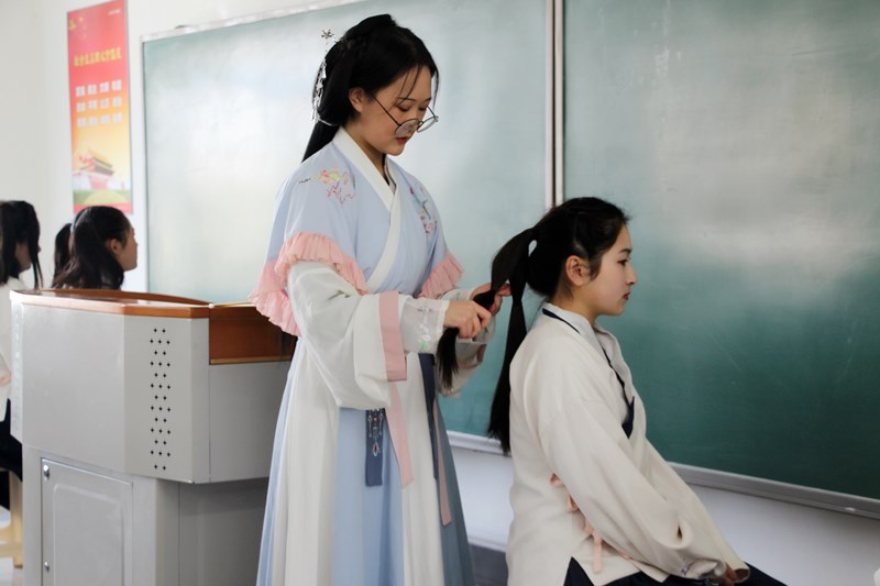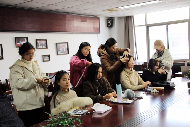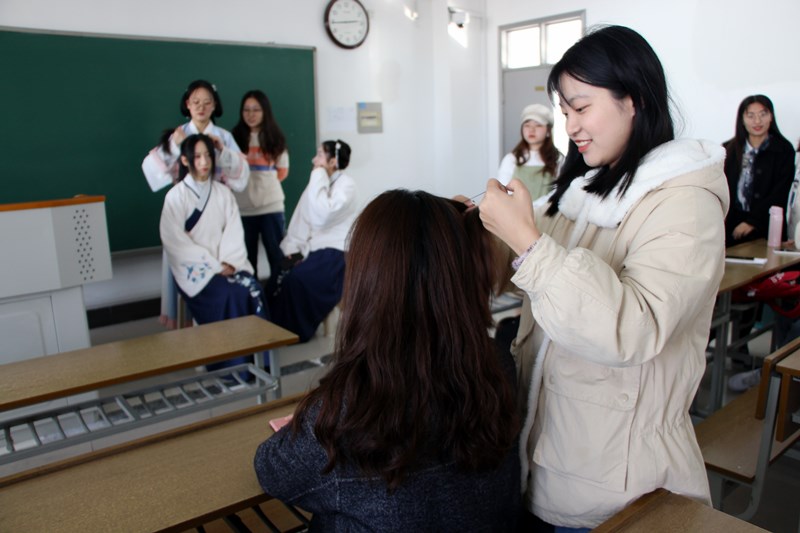 珠翠琳琅,环佩叮当。讲课课堂后,同学们分组合作进行编发比赛,欢声笑语,双手翻飞。李楠向大家介绍了秦汉至宋明时期的经典发型,发型的不断演变与发髻式样的多元发展展现了历史长河中时代风尚与审美意识的变迁。许佳怡则通过不同时期妆发与服装的视频进一步向大家展示了国风古韵的动人魅力。教学课堂在赞叹与收获中结束。