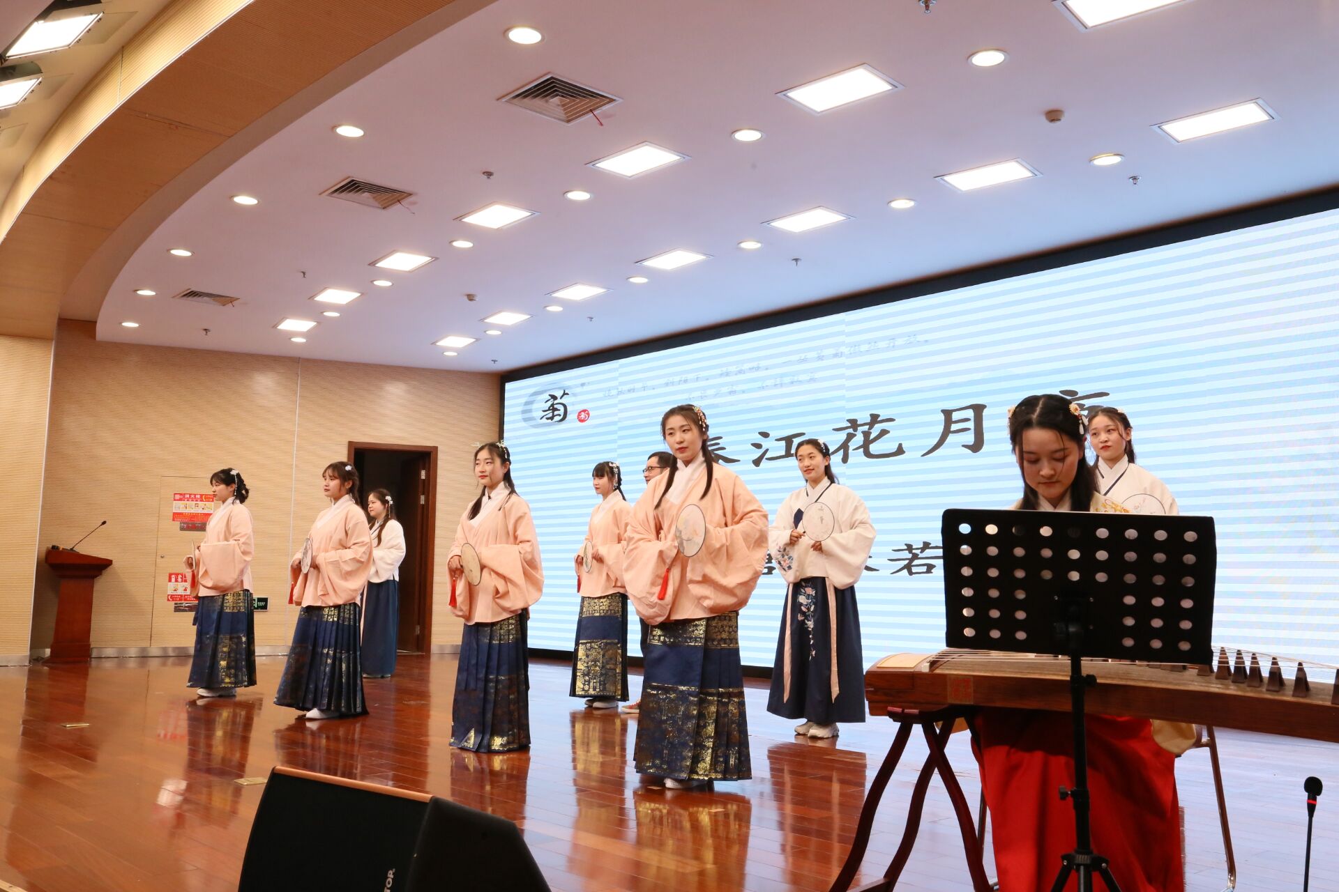 舞台上,采菊诗社同学们的精彩演绎充分展示出中华优秀传统文化古诗词吟唱的独特魅力,也焕发出别样的青春韵味。诗句“人生代代无穷已,江月年年望相似”,抒写真挚动人的离情别绪及富有哲理意味的人生感慨,语言清新优美,韵律宛转悠扬,洗去了宫体诗的浓脂艳粉,给人以澄澈空明、清丽自然的感觉。