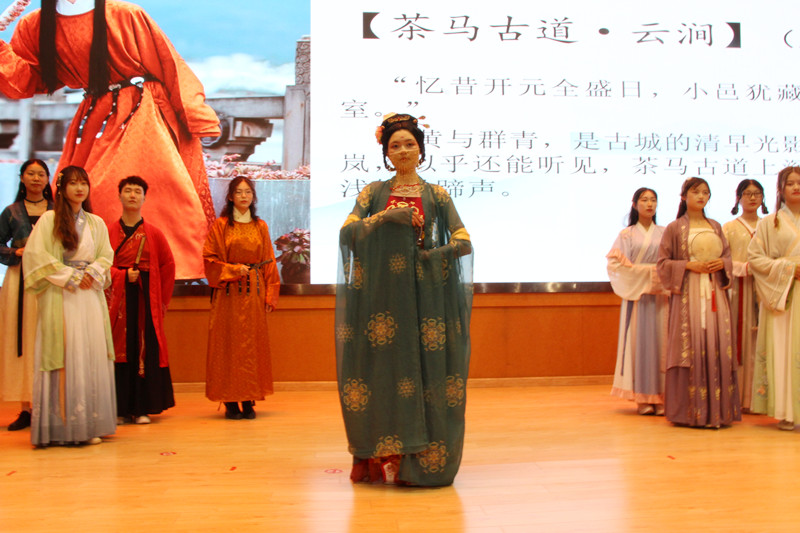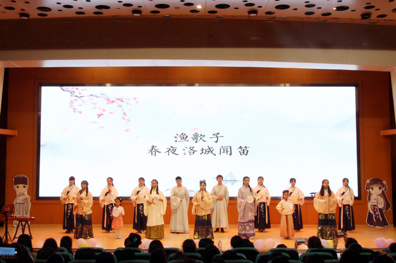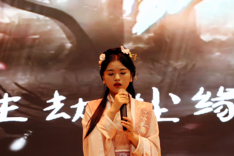 中场互动环节“飞花令”观众踊跃参与,各显身手。张惠琴老师带来了越剧表演《红楼梦——葬花》深情演绎点染百媚千红,婉转唱腔展现伤春之愁。采菊诗社、淮师第一附属小学婵娟诗社以及秦语鸿、秦婉珍联袂带来的诗歌吟诵《渔歌子》、《春夜洛城闻笛》,吟咏之间,掌声迭起。红楼梦学会歌舞《杨花落尽子规啼》将流行音乐与古典舞蹈结合,翩跹动人。朗诵《滕王阁序》字句铿锵,展现了中华诗词歌赋的音韵美。老员工基础教育研究会的舞蹈《苏幕遮》营造了视听双收的多重美感。悠悠千年,熠熠华服。必一运动团委文化艺术中心礼仪部和汉服爱好者带来汉服秀。从北国到南疆,从汉唐到明清,汉服从历史风烟中走来,焕发新的时代光彩。