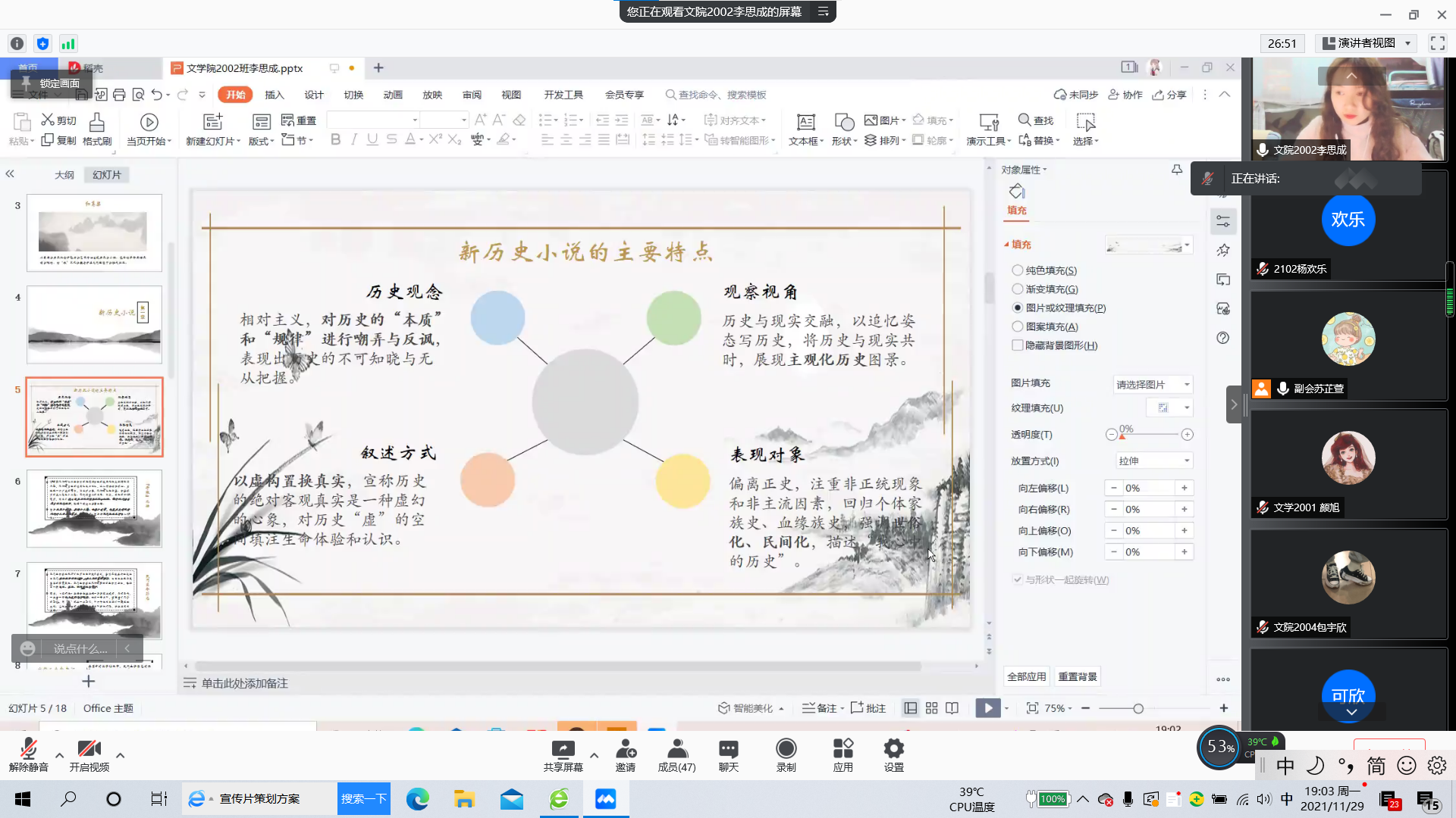 寻根文学是中国文学史上的一个重要课题。寻根文学是什么?寻根文学代表作家有哪些?寻根文学是怎样产生与发展的?它的意义是什么?我们该如何研读它?这些都是我们在阅读寻根文学作品时常有的疑惑。此次活动给了我们一个契机,一个能与志同道合的书友们一起讨论、共同进步的契机。活动过程中,参与分享的同学们生动地介绍了寻根文学代表作品及寻根文学代表作家,深入地讲解了寻根文学及其代表作品的深刻内涵和意义,详实的内容,独到的见解,再配合精心制作的PPT,尽情展示了自己的能力,充分地表达了自己对寻根文学的理解和感悟,使听众受益匪浅。此外,活动中同学们都积极参加了讨论。在讨论区域随时有同学发表自己在听讲过程中产生的疑问及感悟,其余的同学们也及时解答并交流。