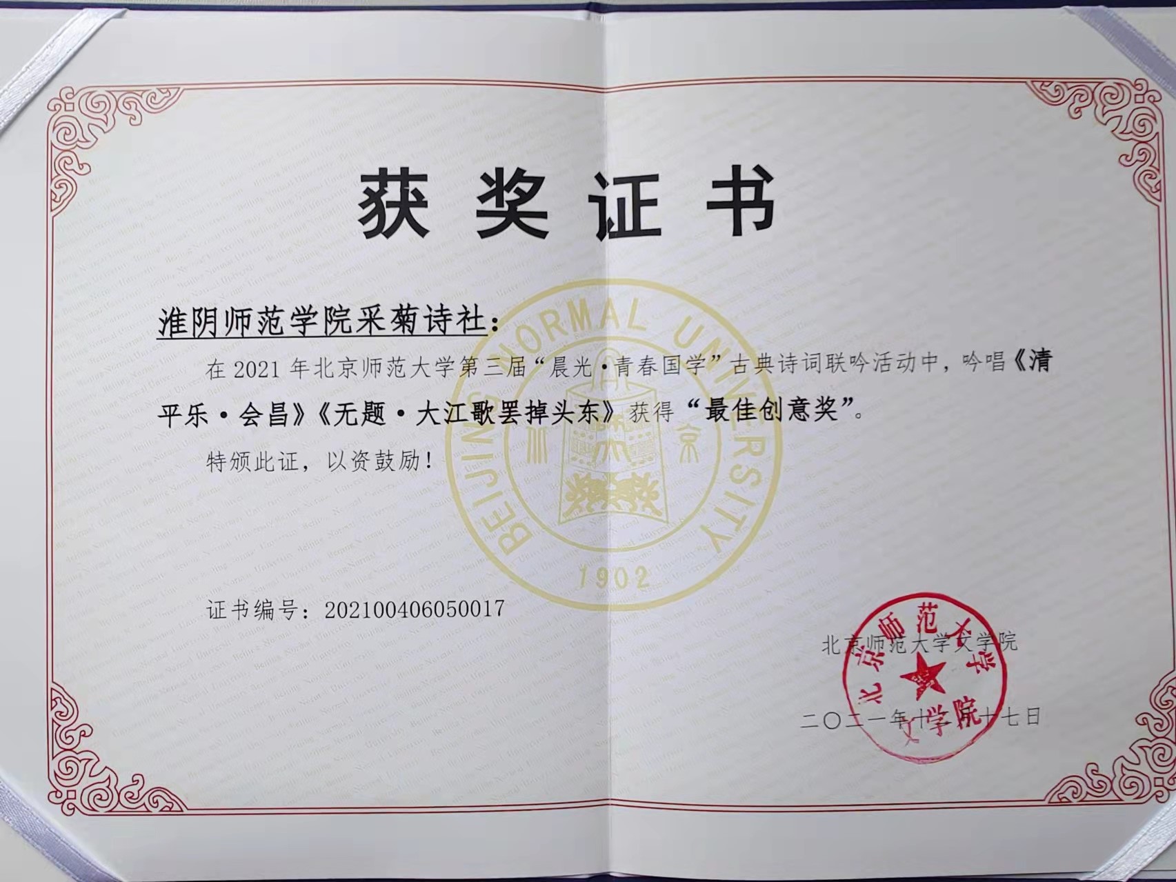 2021年11月21日下午,采菊诗社受邀参加北京师范大学第三届“晨光·青春国学”古典诗词联吟活动,通过线上展演的方式与全国大中小学17个吟唱团体互动交流进行联吟。吟诵作品《清平乐》、《无题》(大江歌罢掉头东)获“最佳创意奖”。