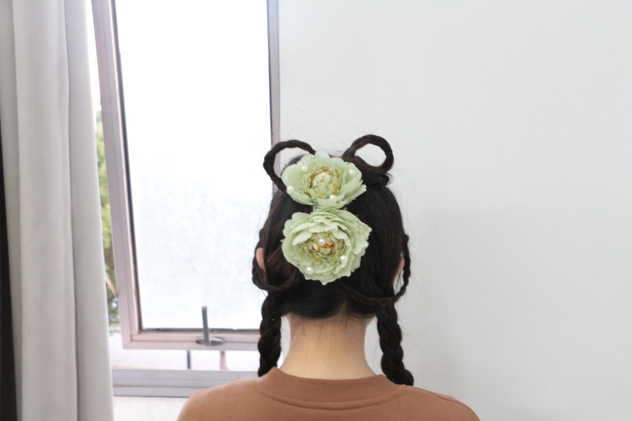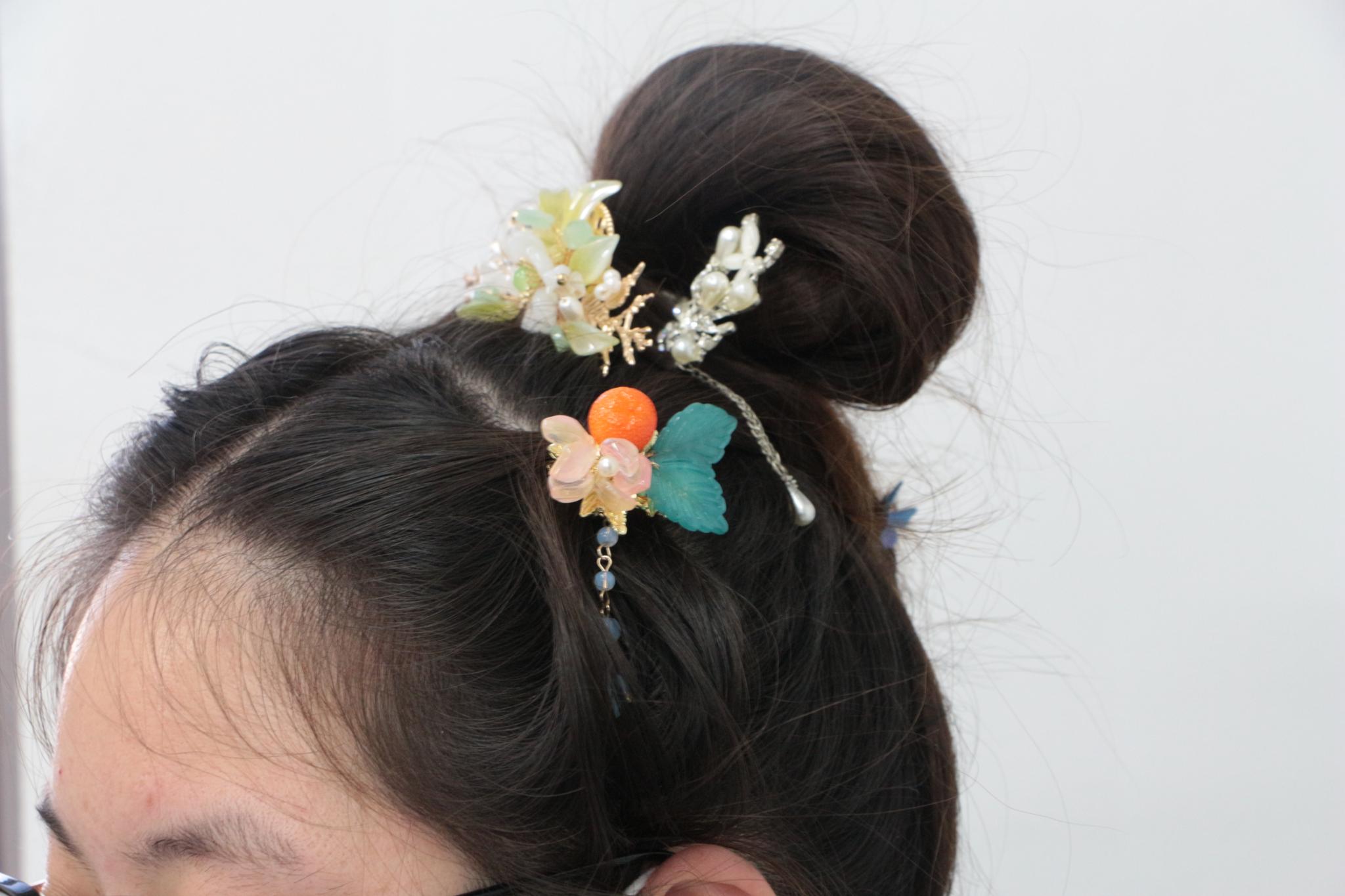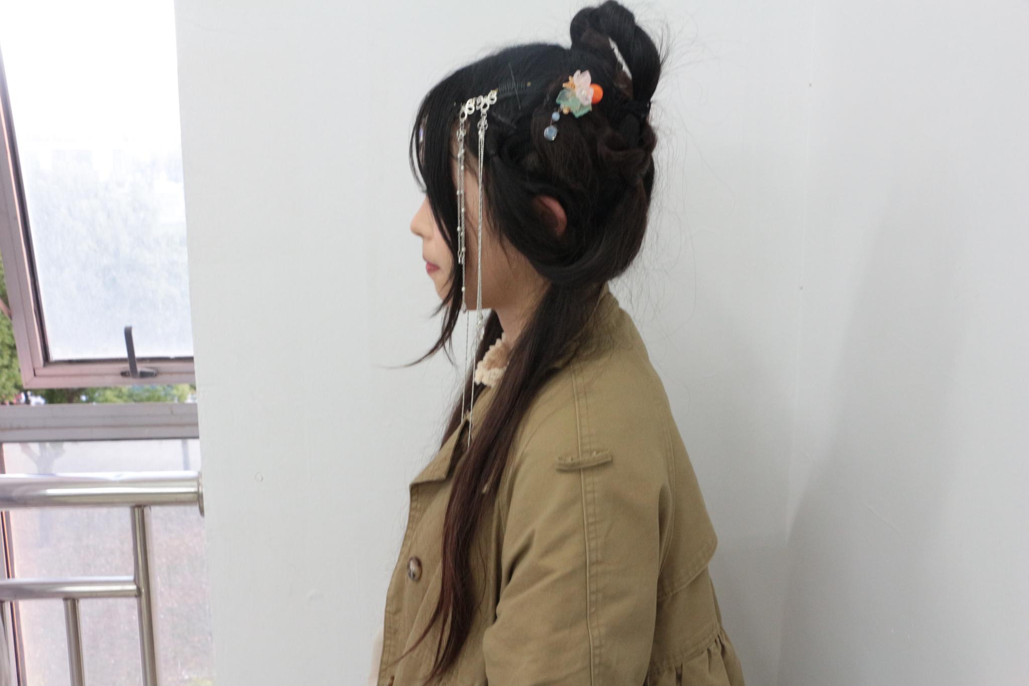 香鬟三尺绾芙蓉,翠琳琅,环佩叮当。活动伊始,许愿介绍了本次活动要求,比赛首先给予发型师和模特二十分钟设计和准备时间,比赛时间共计三十分钟,先完成者可率先挑选饰品对发型进行装饰。比赛过程中选手们分组合作,发型师双手翻飞进行编发,发丝按照梳、绾、编、鬟结、盘、叠等变化而成。有的同学以分、抓、编、取等一系列编发手法挽就温婉发髻,并以银色发饰点缀。有的将头发分两股编盘,发髻微翘,塑造出少女活泼灵俏之感。选手们在比赛时也遇到诸多小问题,如夹子无法固定、碎发过多等,但都被选手们一一克服,做出来的总体效果很好。