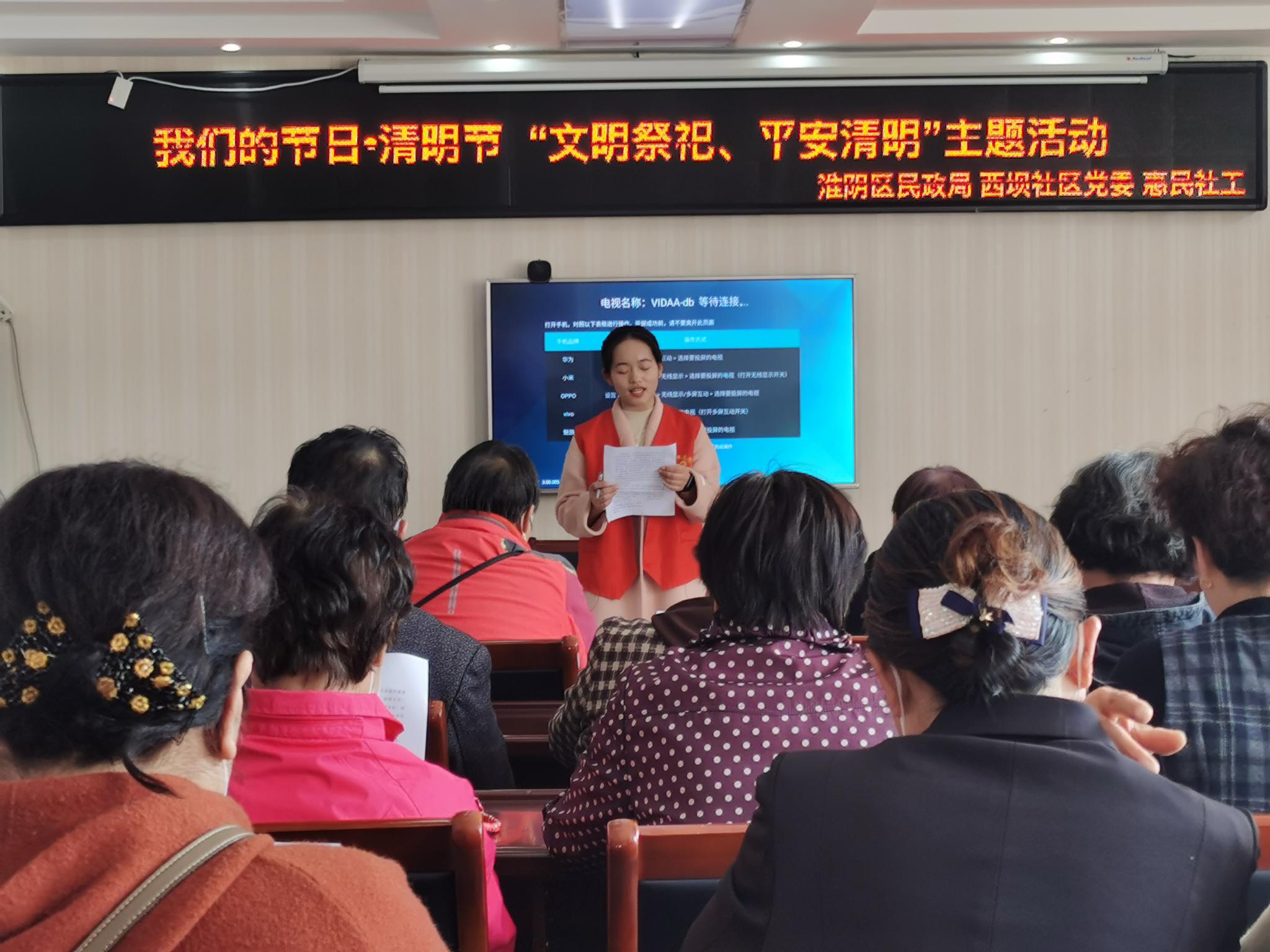 活动开始,社区居民们观看关于清明节由来的视频,志愿者以视频知识问答的方式引入本次活动清明祭祀的主题。接着,志愿者们向社区居民发放文明祭祀倡议书,王靖如向居民们朗读倡议书内容,倡导居民选择鲜花祭祀、植树祭祀、家庭追思会等文明环保的方式来祭祀逝去的亲人。
