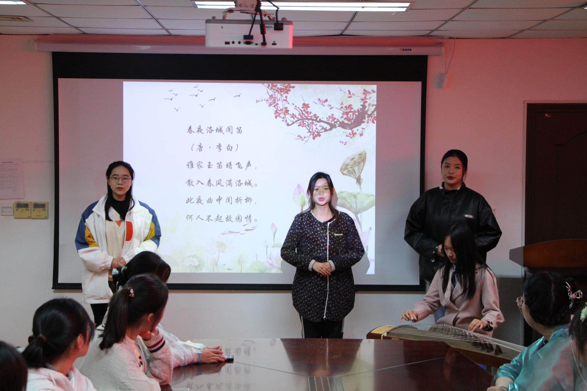 推心置腹,耳听心受。管婷婷老师先以当下的疫情局势和同学们阅读文章情况展开一段暖心的对话。再由老师和同学们之间的提问互动,分享经历经验以及穿汉服(唐服,宋制,明制)的同学上台对自己服饰发表想法,传播汉服文化,最后在教唱李白的春夜洛城闻笛,张志和的渔歌子,苏东坡的定风波悠扬的歌声中结束。