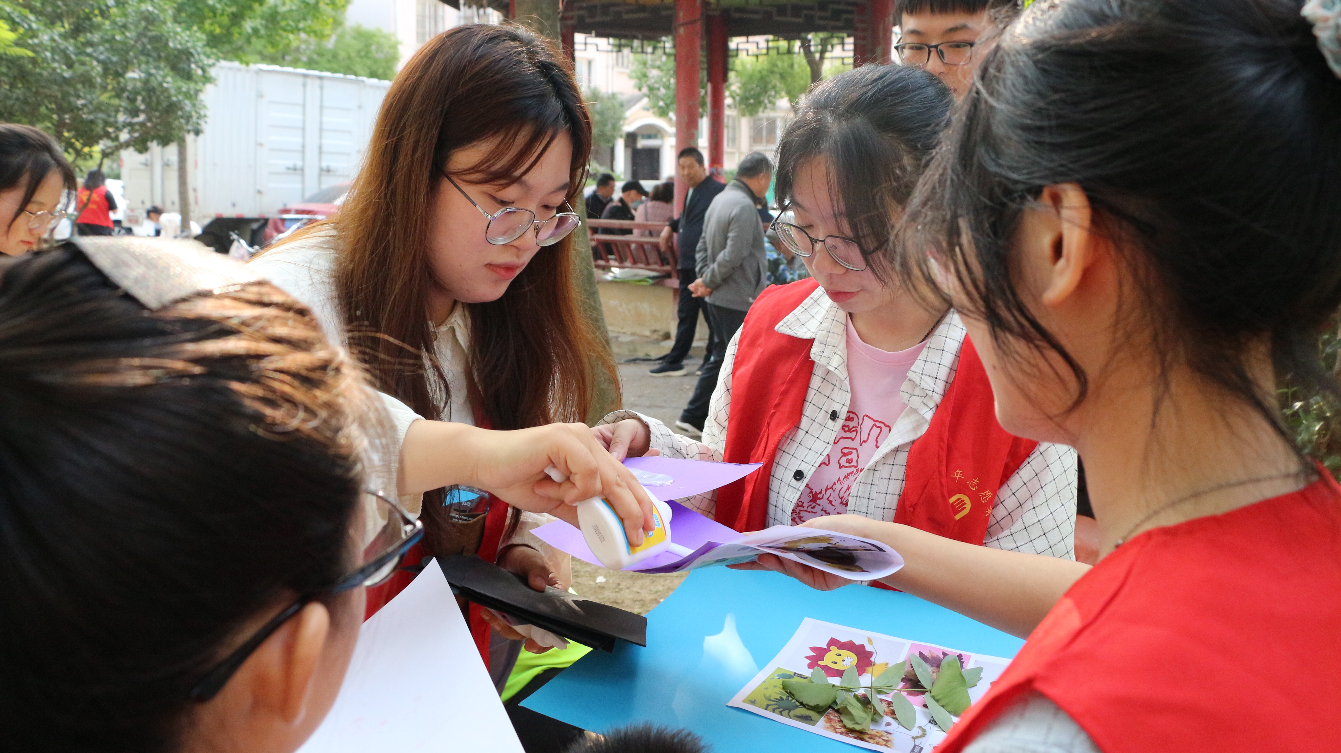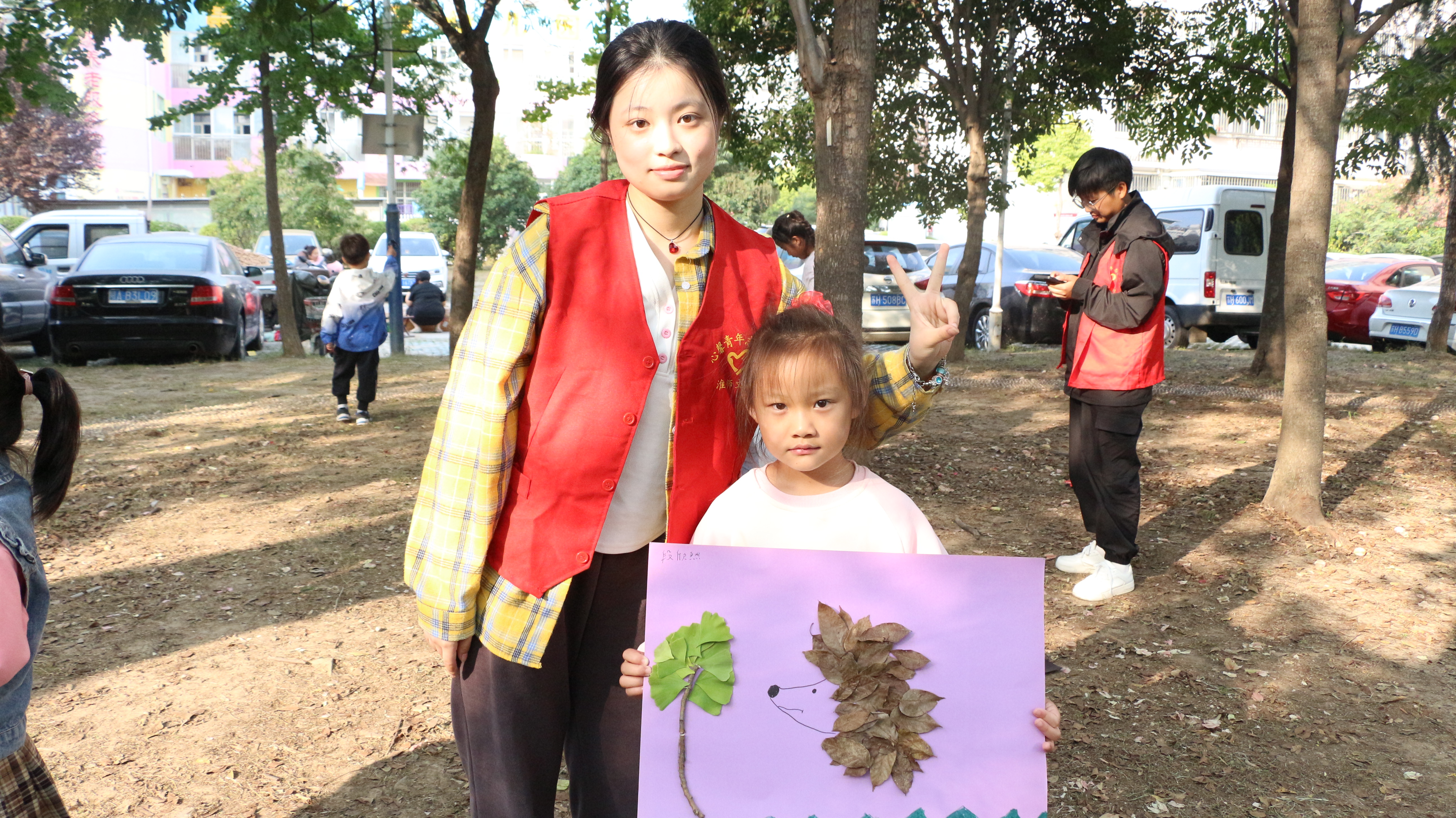 志愿者让孩子们挑选自己喜爱的图画,并根据图画在小区中寻找拾取合适的落叶,在志愿者们的陪伴下,孩子们纷纷发动想象,用落叶拼贴创造出一个个可爱美丽的图像。在孩子们眼中,落叶不代表萧瑟与枯萎,而是美的化身,是大自然赠与我们的礼物。完成画作后,孩子们分别展示并介绍了自己的作品。