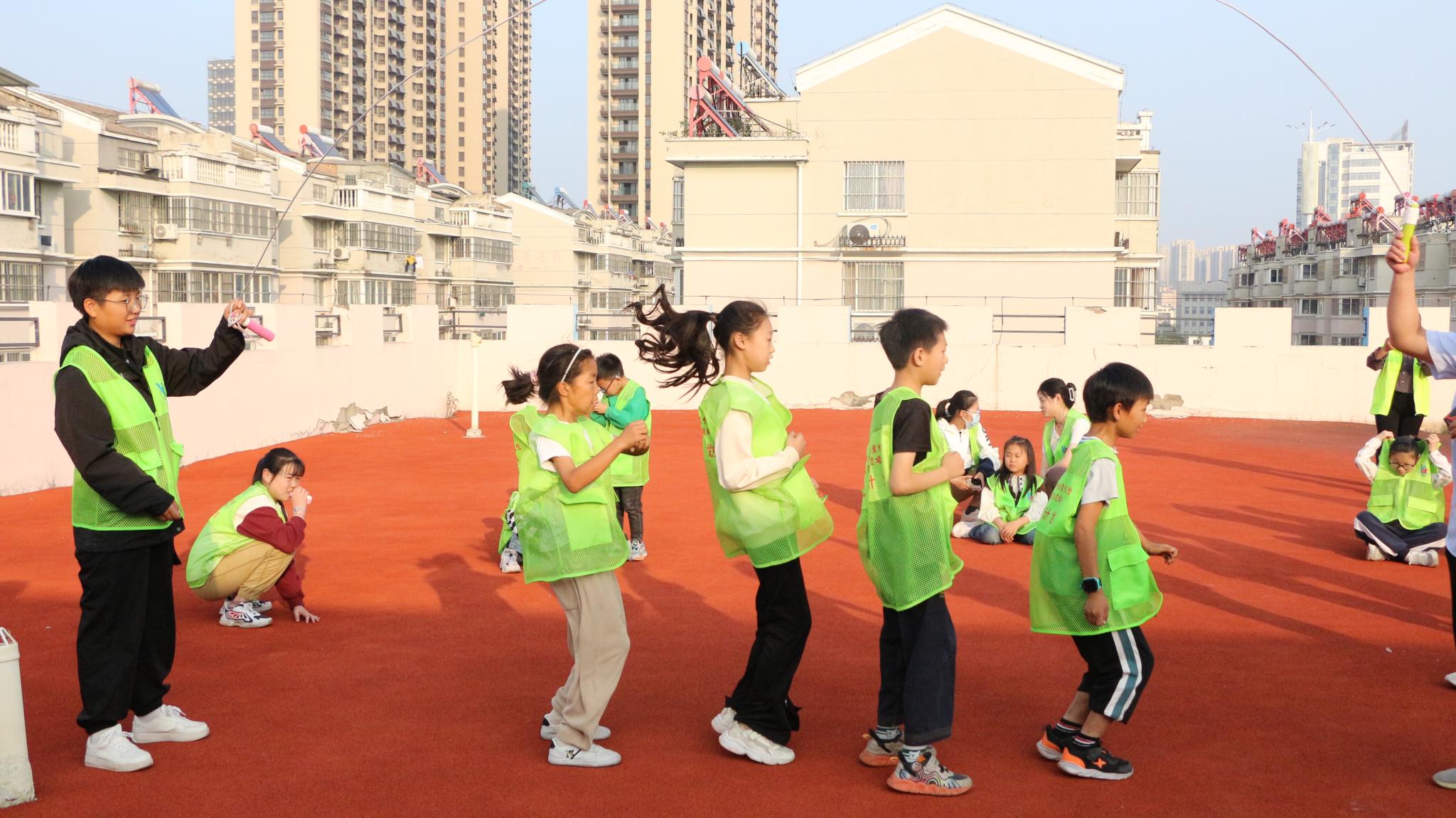随后,志愿者又带着孩子们来到操场,与孩子们一起跳长绳,有特长的孩子还展示了花样跳绳的技巧,孩子们也在志愿者的带领下学会了转陀螺,现场一片欢声笑语。活动最后,志愿者与孩子们一同合影留念。