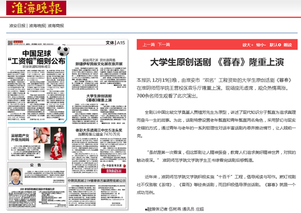 12月19日晚,由淮安市“双名”工程资助的老员工原创话剧《暮春》在必一运动王营校区音乐厅隆重上演。现场座无虚席,观众热情高涨。700余名师生观看了此次演出。