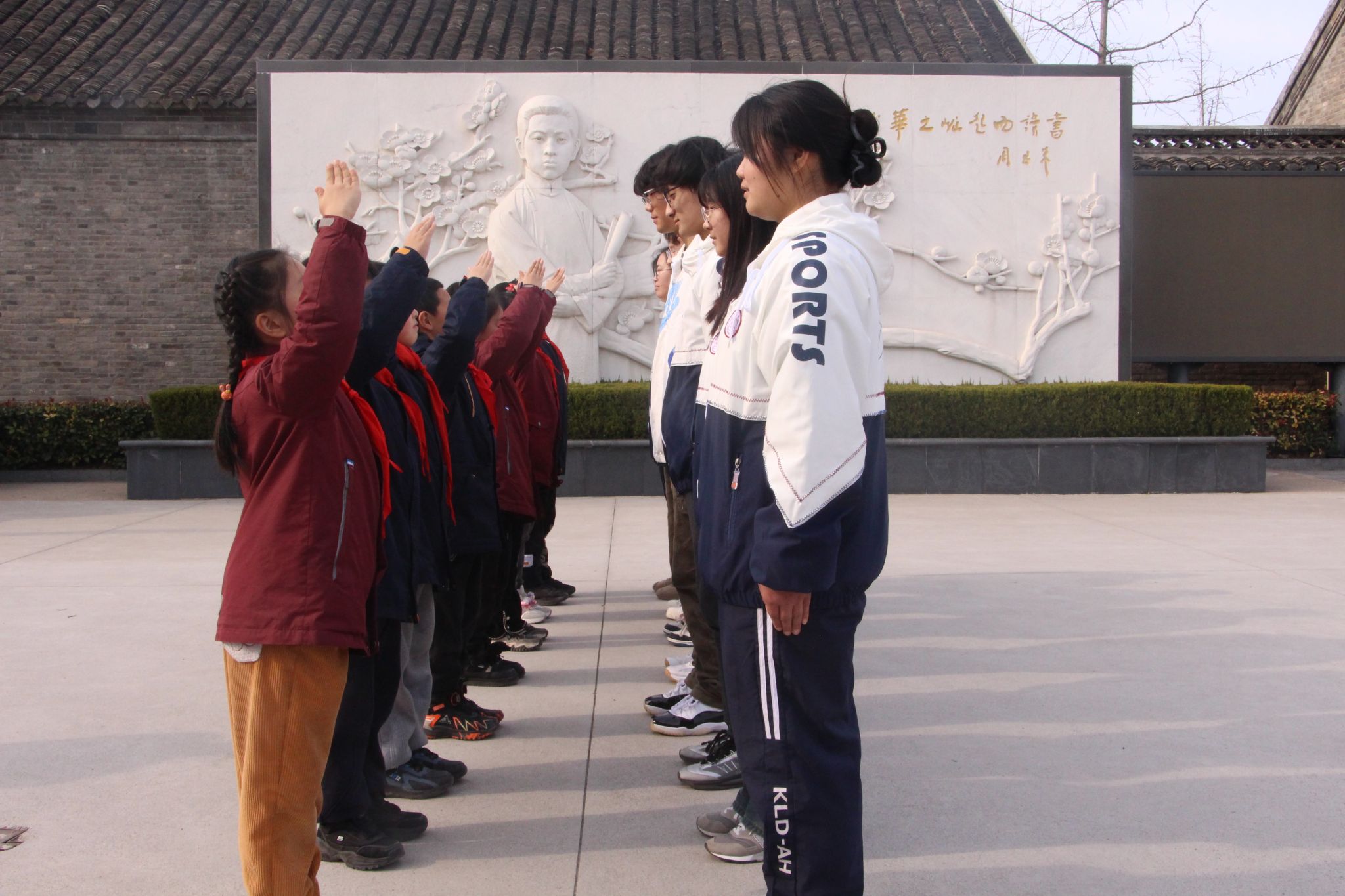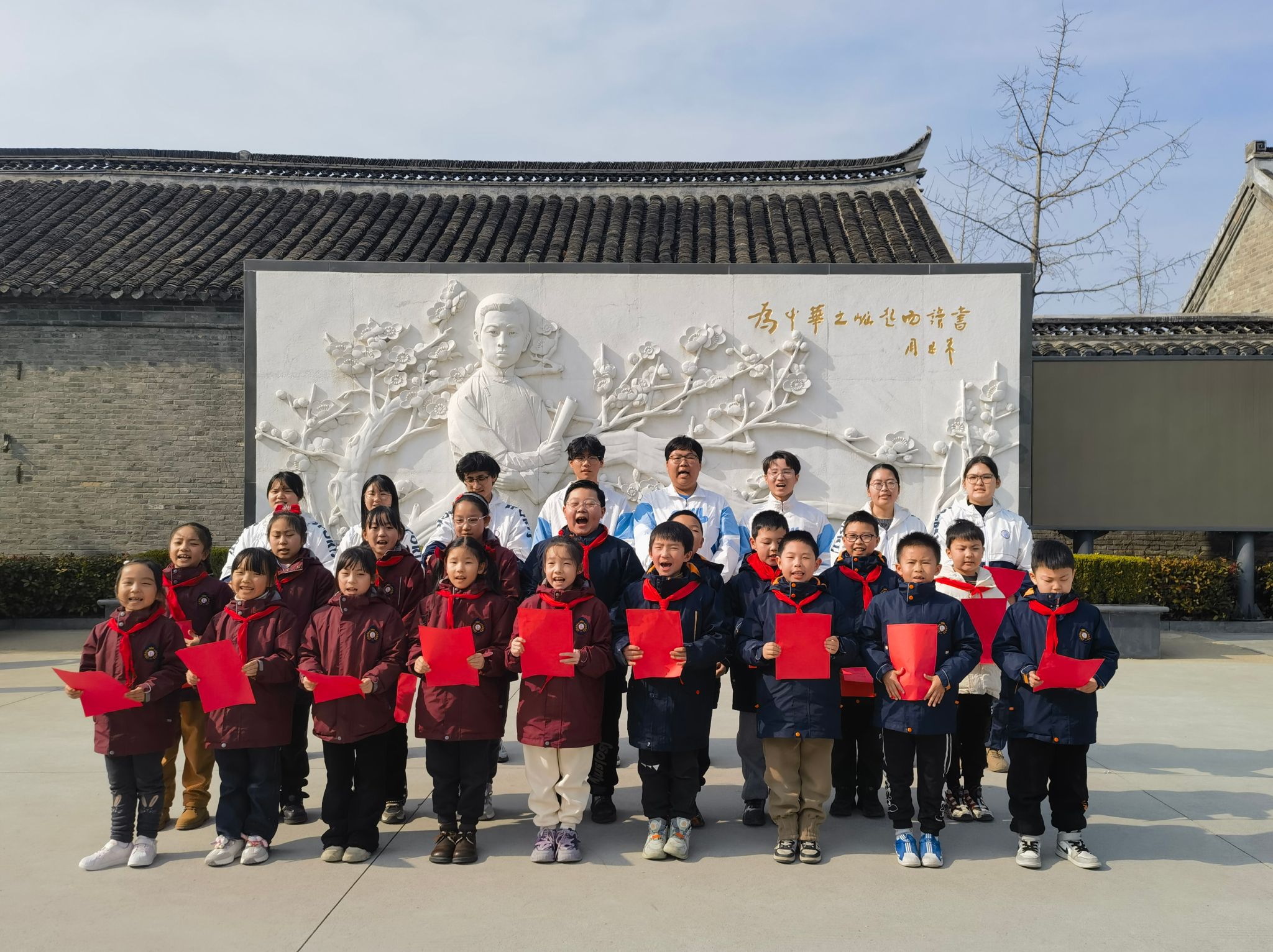 大家齐聚在童年读书处广场,庄严肃立在刻有少年周恩来和盛开梅花的汉白玉浮雕前。周恩来生前最喜欢的梅花正是他矢志不渝高尚品格的象征,“为中华之崛起而读书”的手迹也正是童年周恩来勤奋努力的人生目标。