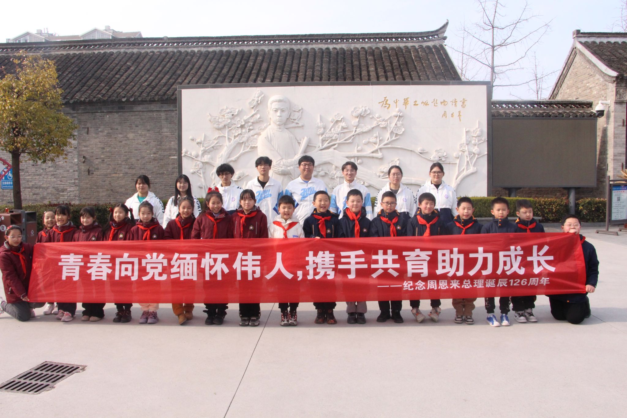 为纪念周恩来总理诞辰126周年,进一步学习周恩来崇高精神风范,3月3日下午,淮师必一运动携手淮师一附小师生在周恩来童年读书旧址开展周恩来总理诞辰126周年纪念活动。两校师生代表40余人参加活动。
