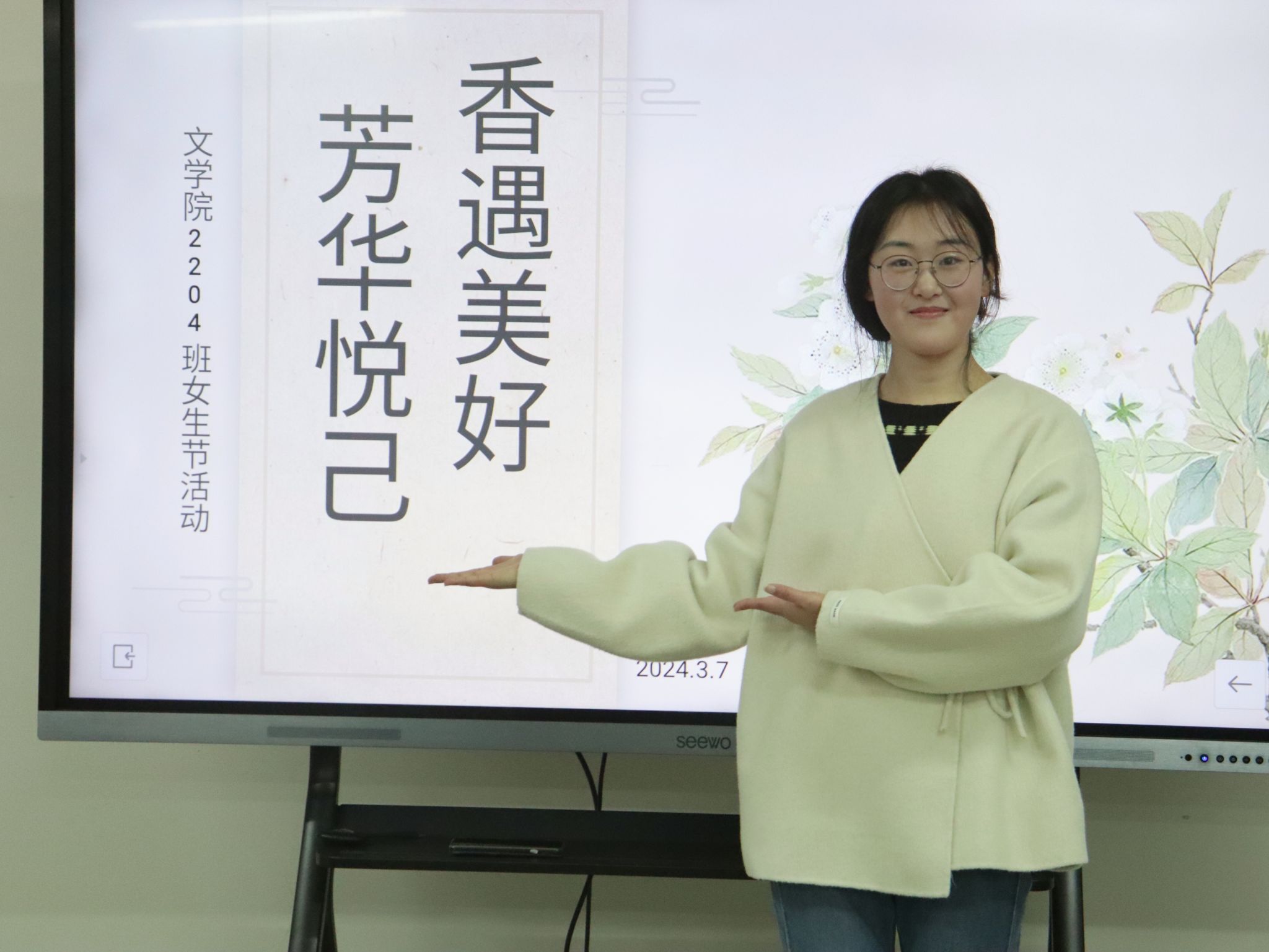 3月7号女生节,2204班在员工处汇心团体室举办了“芳华悦己 ‘香’遇美好”女生节活动。