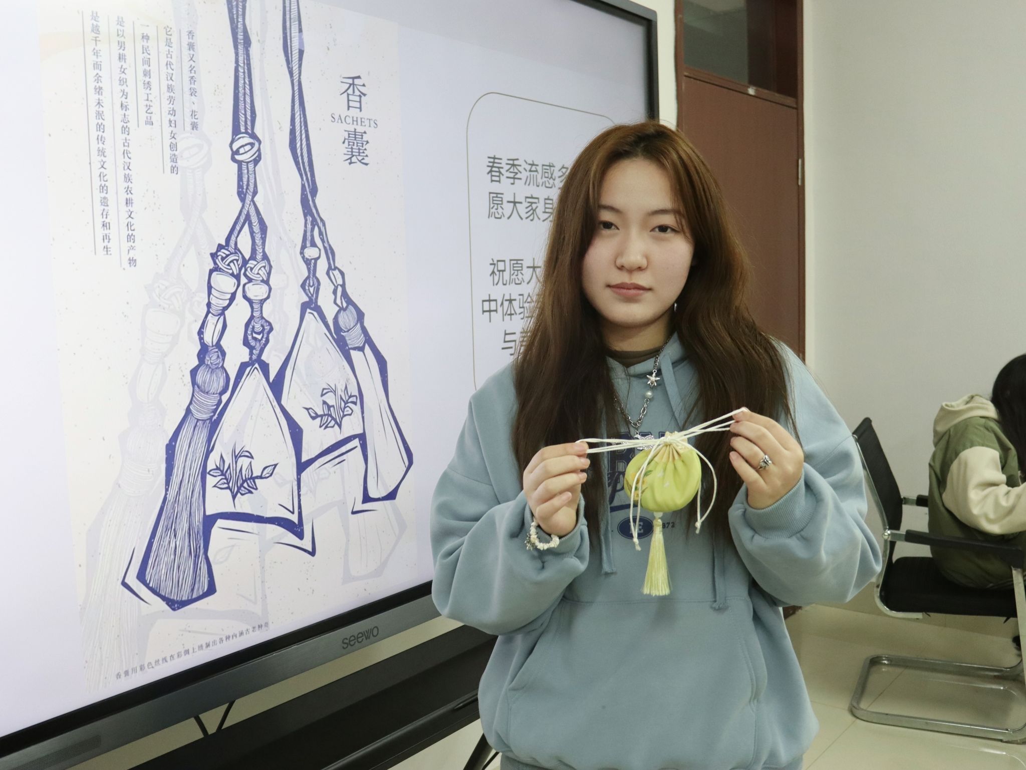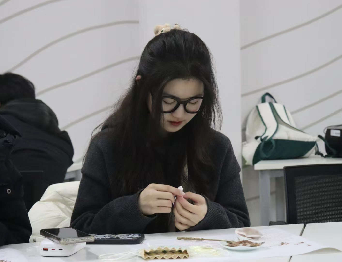 主持人首先介绍了香文化的历史来源和现代影响,让同学们对中国香文化有了初步的了解。制作香囊有两种方式,一是安神助眠香方,由桃花、玫瑰和艾草香粉配成;另一种是提神醒脑香方,由薄荷、檀香和丁香配成。大家耐心地用勺子将碟子中的香粉一点一点装到无纺布袋中,沉浸在香气中,美好的香气和福气在指尖流转,大家兴致高涨。