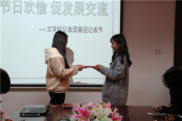 记者团团长吴迎雨通过PPT的形式,向同学们介绍了中国记者节的相关情况。她提到,经国务院正式批复,每年11月8日定为记者节,记者节同教师节、护士节、医师节一样,是我国仅有的四个行业性节日之一,使成员们初步了解了记者节的由来。此外,通过一段关于“普通市民对记者这一职业的看法与期望”的视频,来启迪团内成员做一个明确自我价值、坚定自我梦想的新时代青年。