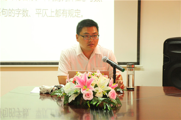 葛志伟还分别向大家详细介绍了关于诗、词的一些基本常识。“学诗先识体”,葛教授借用具体例子,讲述了古体诗与近体诗的格律与用韵特点,并着重强调了五言律诗“仄起平收”的规律。他提出,写近体诗是“带着镣铐跳舞的艺术”,建议初学者写诗先从绝句写起,开始时不需要刻意注意格式;而“学词先识谱”,葛教授提出填词是“依葫芦画瓢的艺术”,并通过分析自己所填的词《忆秦娥》,向同学门简介了填词的一些基本规律,建议同学们填词先从小令开始,同时推荐大家去阅读“学词入门第一书”——《白香词谱》。
