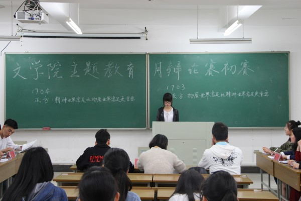 本次主题辩论赛初赛共有六个班级参与,三场辩论赛同时进行。各代表队的辩题分别为“读文学作品应抱有‘作者未死/已死’的态度”、“精神世界富足比物质世界富足更重要/物质世界富足比精神世界富足更重要”、“社会担当比自我价值实现更重要/自我价值实现比社会担当更重要”。在主持人宣读了“文明礼貌、仪表端庄、态度大方”等要求后,辩论赛正式开始。辩论过程中,双方辩手准备充分、立论明确、提纲挈领,在开篇陈词环节便展现了良好的综合素质,深入浅出地解读了己方辩题。在之后的环节中,双方辩手紧紧抓住对方辩论的漏洞展开激烈的对峙,言辞犀利、舌绽莲花,巧妙地引据经典,或循循善诱、或不断反诘,双方辩手你来我往,紧张激烈,将辩论赛气氛推至高潮。辩手们敏捷的思维、出色的口才、良好的风范令在场观众为之折服。