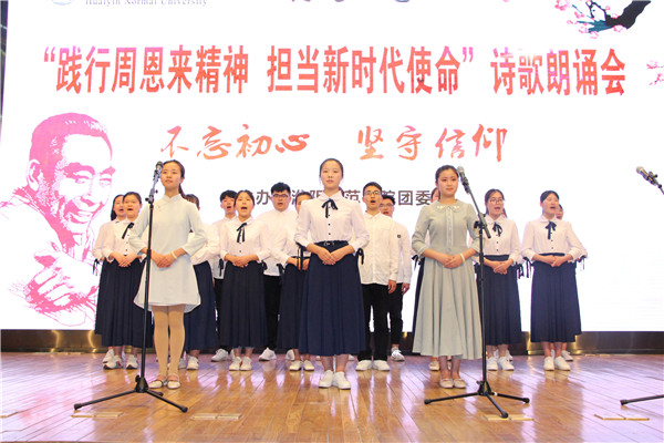 朗诵会在《海棠花开,我们陪您》的集体表演中拉开序幕。朗诵以个人领诵、小组齐诵、多声部合诵和全班合诵等形式交替呈现。让人们在感悟恩来精神的同时领略经典、享乐其中。教科院的《总理办公室的灯光》和历史公司的《周总理,你在哪里》更是勾起了在坐每一个人对总理深切的思念。尤其是对高潮部分恰到好处的陈述渲染,使得整场表演节奏紧凑、抑扬顿挫。最后许芳红老师为全体师生朗诵了《为祖国而歌》。声情并茂、开合有度,表达了对祖国美好未来的期许。