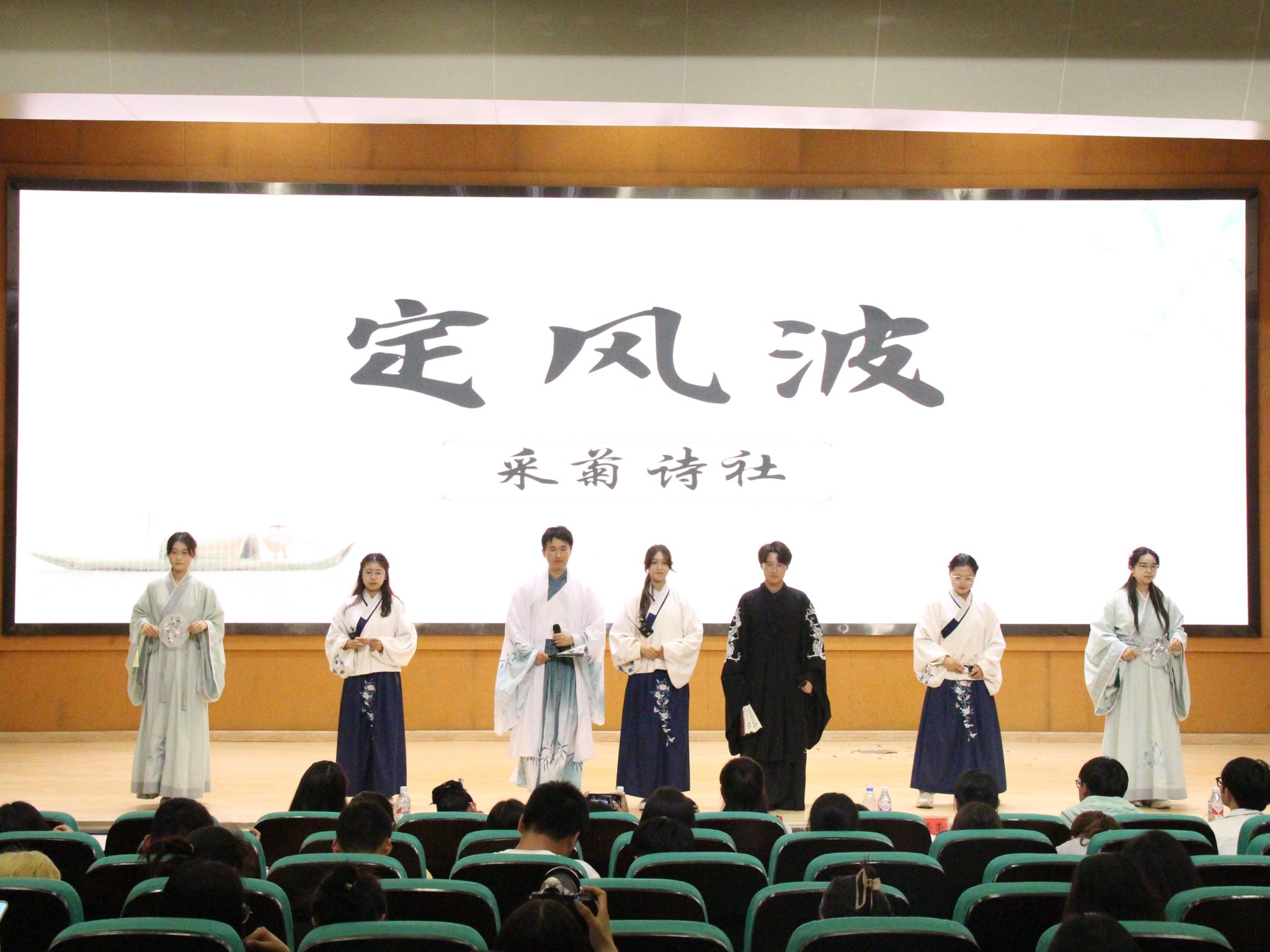 从余音绕梁的国乐开始,采菊诗社的成员们将活动拉开了序幕。小提琴版的《浮光》空灵、电子琴版的《彩云追月》轻快、古筝演奏的《彝族舞曲》带着一番民族交融的韵味,而这三种乐器合奏的《梁祝》交织着传统与现代、高雅艺术与民间戏曲,东西方美学在此形成了具象。在接下来的活动中,采菊诗社又带来了吟唱与朗诵《定风波》和吟唱表演《春江花月夜》。苏轼豪迈旷达,张若虚沉着善思,但两首诗皆以隽永笔调表达了一种人生哲思。采菊诗社的成员们置身诗中,一吟一摇,体态端庄,吟唱优美,与诗人展开了千古对话。
