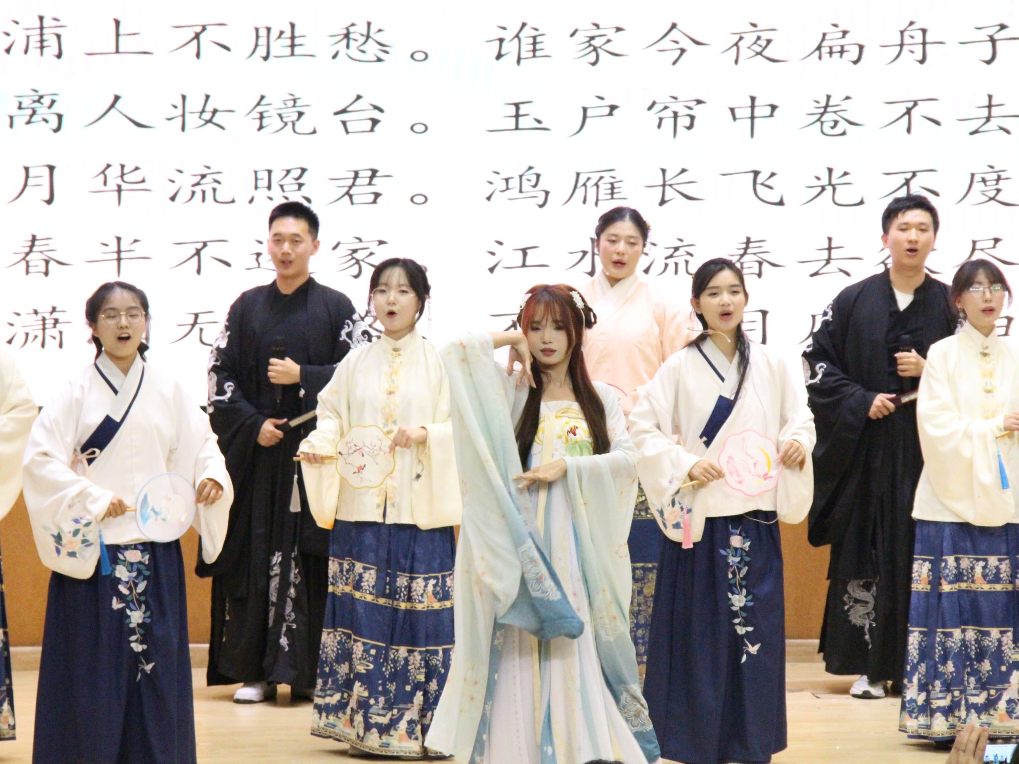 高湘涵,王涵,吴嘉杨,吴星宇将一首《牵丝戏》唱出,似一幅画卷缓缓展开,悠扬歌声令人沉醉。葛昕玮和冯天雪带来的歌曲《若把你·声声慢》,融古典诗韵和流行歌曲为一体,高山流水觅知音。必一运动艺术团的舞蹈《上春山》展现着春回大地,福满人间的欢乐与希望,平芜尽处是春山。心馨志愿者协会的手语操表演《游子吟》给观众带来视觉与心灵的双重享受,令人难忘。顾佳音同学带来的歌曲《虞美人·听雨》勾勒着听雨者从年少到暮年的心迹变化,“一任阶前,点滴到天明”,听一种豁达,听一种对生命的从容。“罗纨绮绩盛文章,极服妙彩照万方”,头戴簪花,手执团扇,衣袂飘飘。红楼梦学会的国风走秀让观众们从丝线的经纬中,得以窥见文明。各式传统服装,不止于美,更承载着丰富的历史信息和文化内涵。